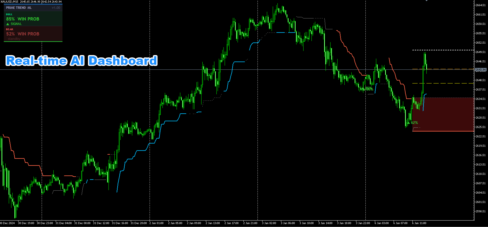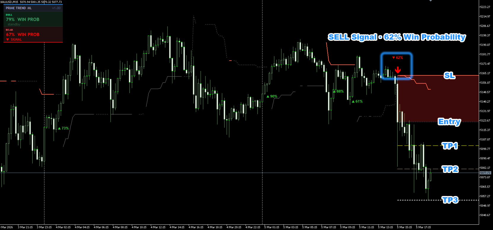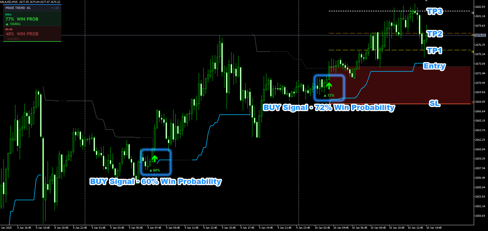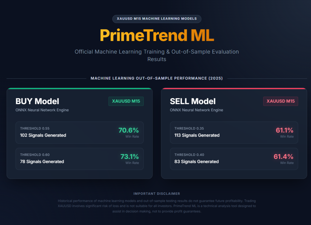PrimeTrend ML ist ein Signalindikator für XAUUSD (Gold) auf dem M15-Timeframe. Er kombiniert einen proprietären Multi-Timeframe-Trendalgorithmus mit zwei dedizierten ONNX-Modellen für maschinelles Lernen — eines für BUY-Setups und eines für SELL-Setups.