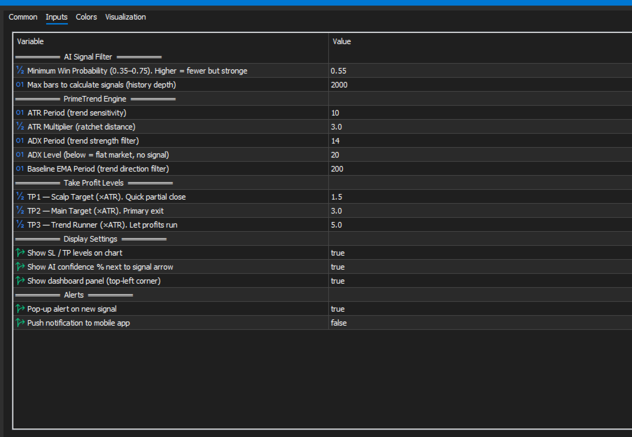 PrimeTrend Engine — ATR-Periode, ATR-Multiplikator, ADX-Filterlevel, Basis-EMA-Periode. Steuert die Trendempfindlichkeit und die Erkennung von Seitwärtsmärkten.