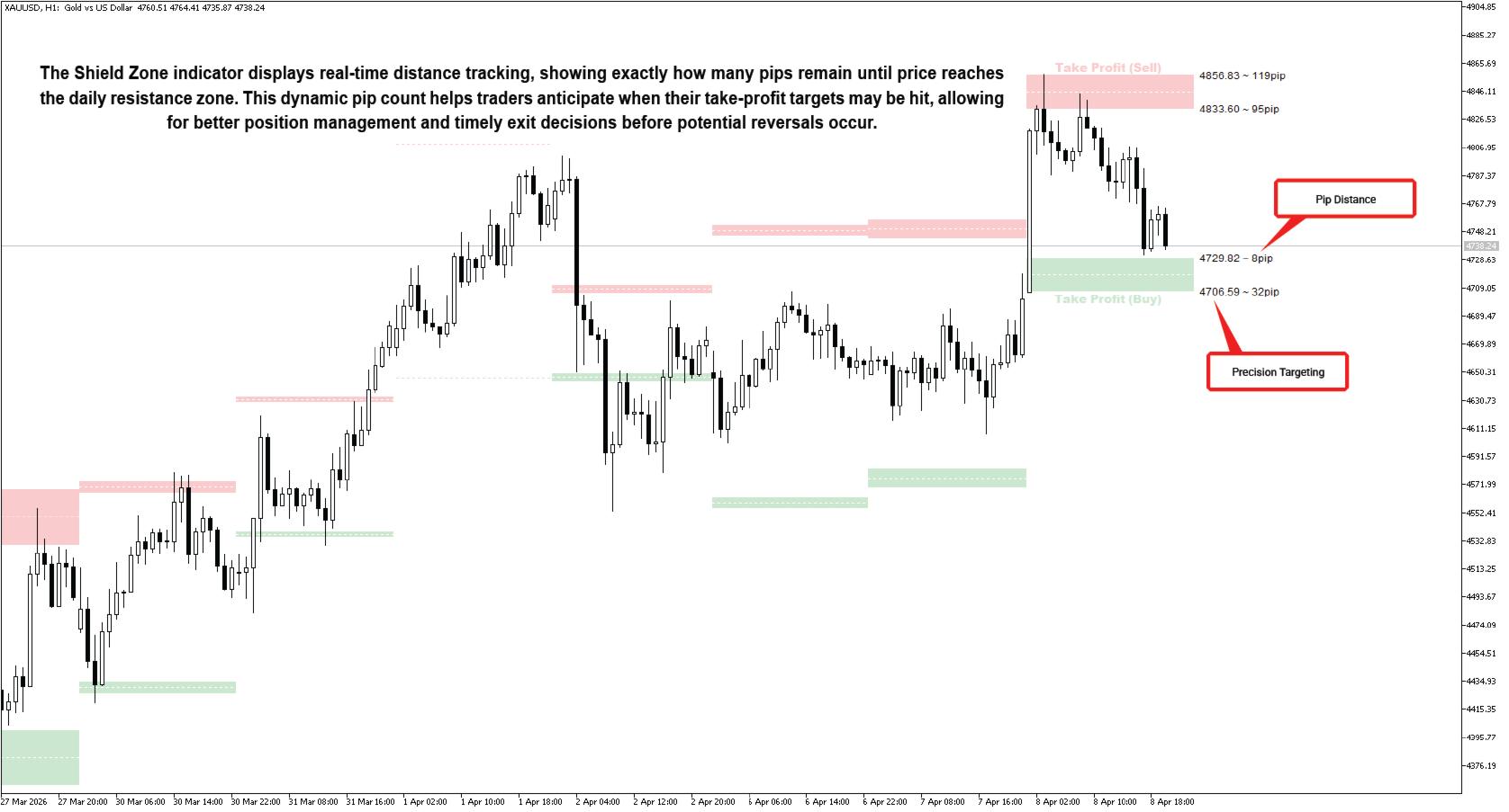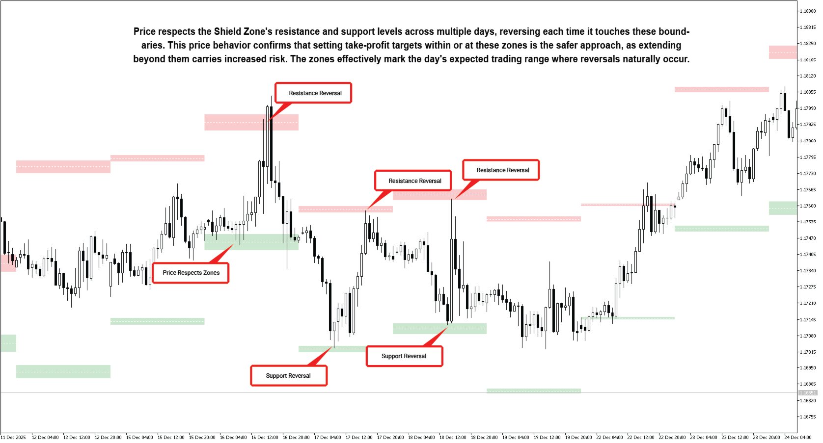 Das Konzept dahinter Schutzzone ist einfach, aber effektiv. sicherer Bereich Der Bereich zwischen Widerstands- und Unterstützungszone stellt die erwartete Handelsspanne des Tages dar. Sobald der Kurs eine der beiden Zonen erreicht, … Widerstandszone oder die Die Unterstützungszone signalisiert, dass der Markt sein Tagesziel möglicherweise erreicht hat, was auf einen potenzielle Umkehrung ist nahe. Auf diesen Niveaus können Händler erwägen, bestehende Positionen zu schließen, um Gewinne zu sichern, oder sich auf einen Anstieg vorbereiten. Umkehrsignal um in die entgegengesetzte Richtung wieder einzusteigen. Dies macht den Indikator besonders wertvoll für diejenigen, die suchen tägliche Gewinnziele Und Ausfahrtzeit-Leitfaden in ihren Handelsroutine .