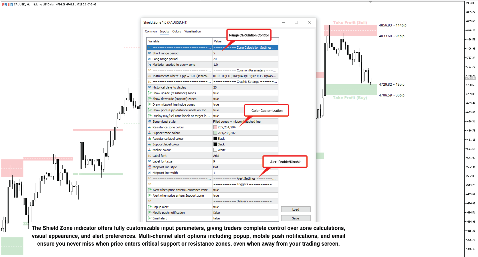 - Anpassbare Visualisierungen: Wählen Sie Zonenfarben, Beschriftungsfarben und den Stil der Mittelpunktlinie . Außerdem können Sie Zonenbeschriftungen, Kauf-/Verkaufsbeschriftungen und die Mittelpunktlinie ein- und ausschalten.