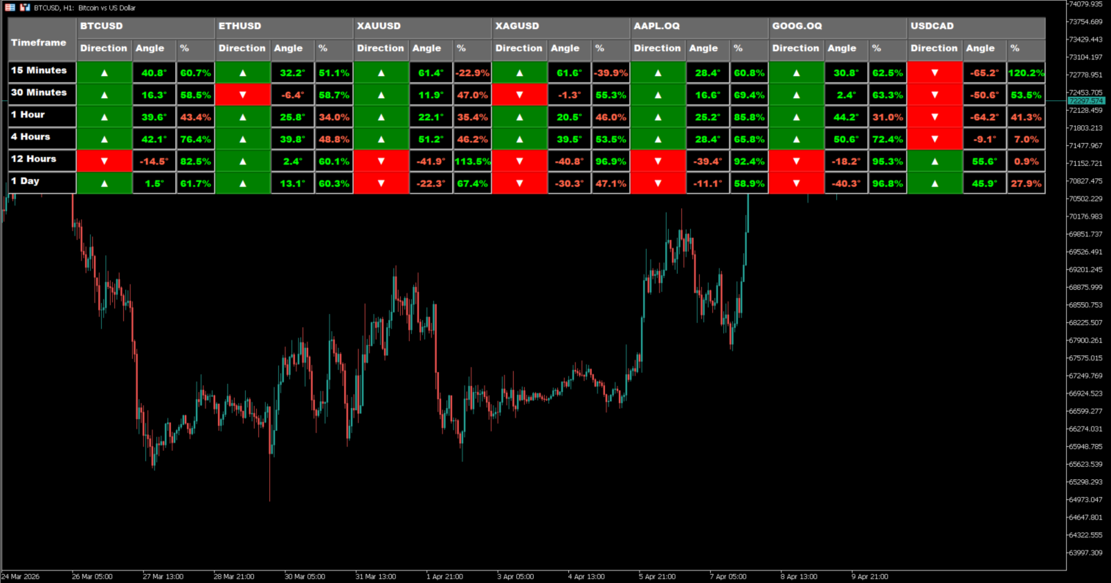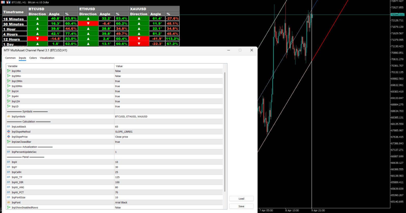Anstatt mehrere Kanalobjekte gleichzeitig zu zeichnen, organisiert der Indikator die wichtigsten Kanalinformationen in einem strukturierten Panel. Für jeden aktivierten Zeitrahmen und jedes ausgewählte Symbol werden drei praktische Elemente angezeigt: Kanalrichtung, Kanalwinkel und die aktuelle Preisposition innerhalb des Kanals in Prozent.