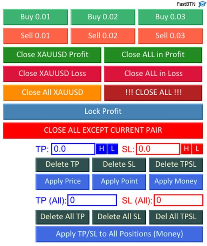 - Der Handel ist mit erheblichen Risiken verbunden. FastBTN ist ein Hilfsprogramm, keine eigenständige Handelsstrategie. Es bietet keine Handelssignale, Anlageberatung oder Gewinngarantien. Testen Sie den EA immer auf einem Demokonto, bevor Sie ihn in einer Live-Umgebung einsetzen.
