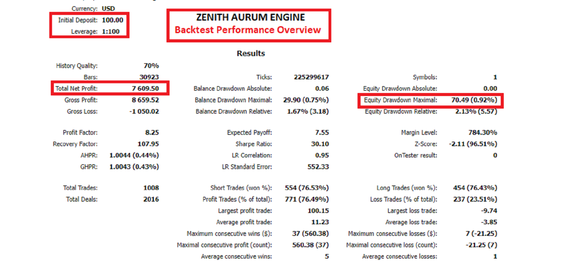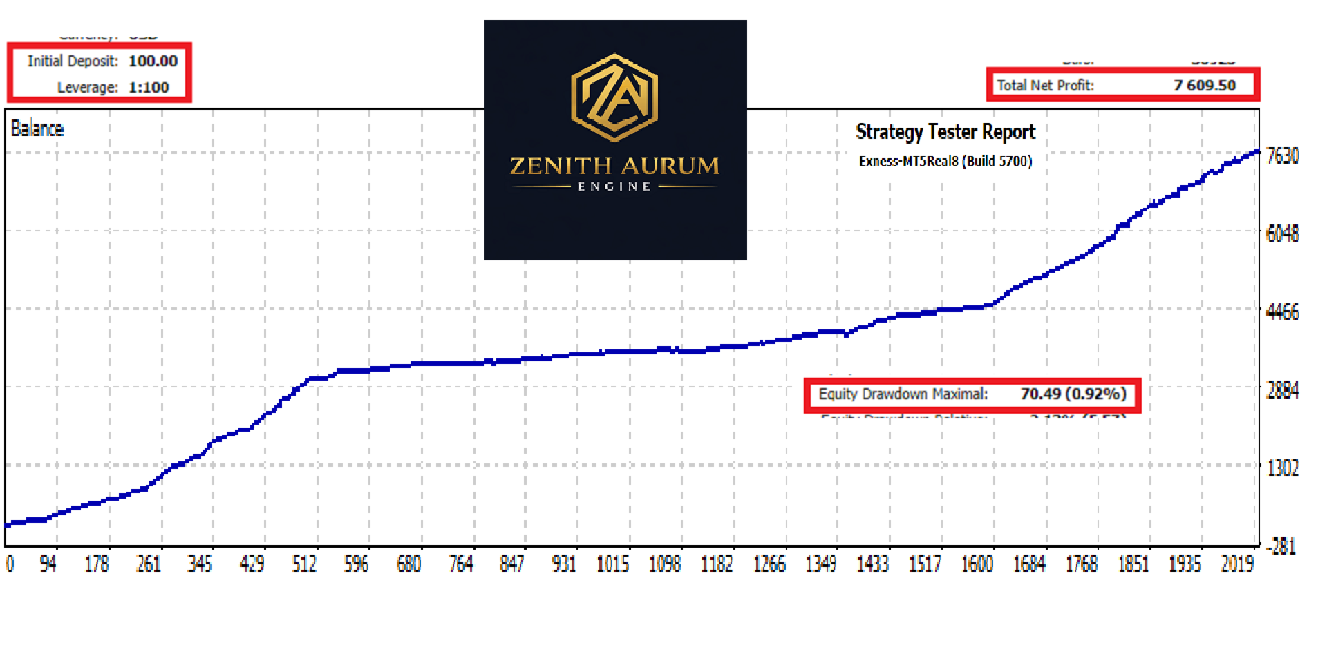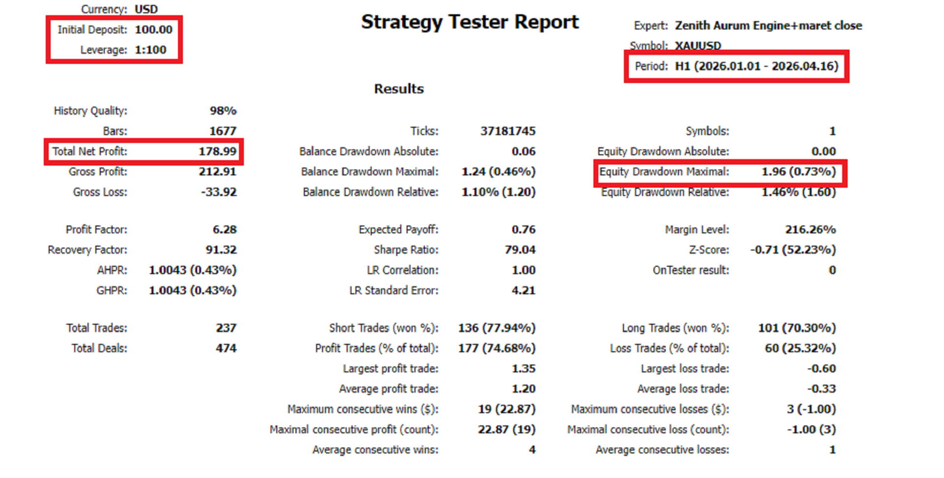 Zenith Aurum Engine wurde unter realen Marktsimulationsbedingungen auf XAUUSD (Gold) unter Verwendung von H1-Zeitrahmen-Daten von Januar 2019 bis April 2026 rigoros getestet.