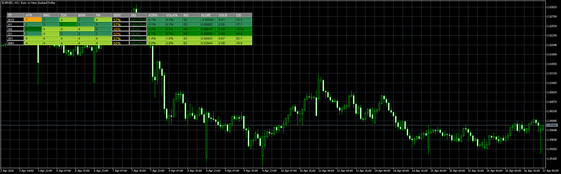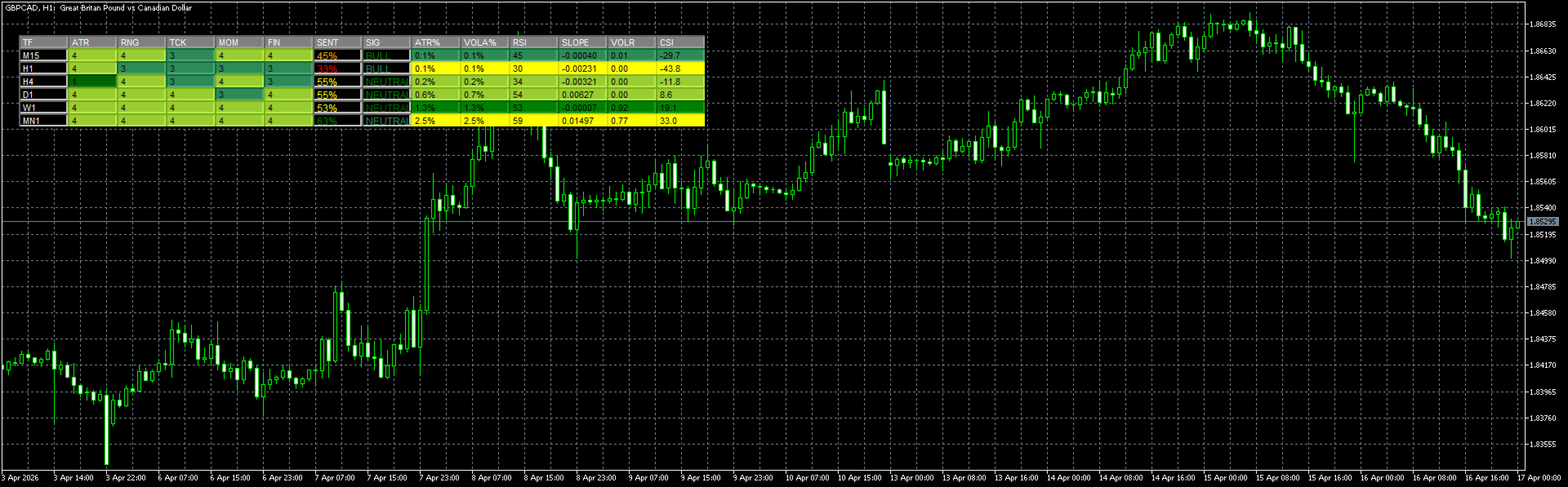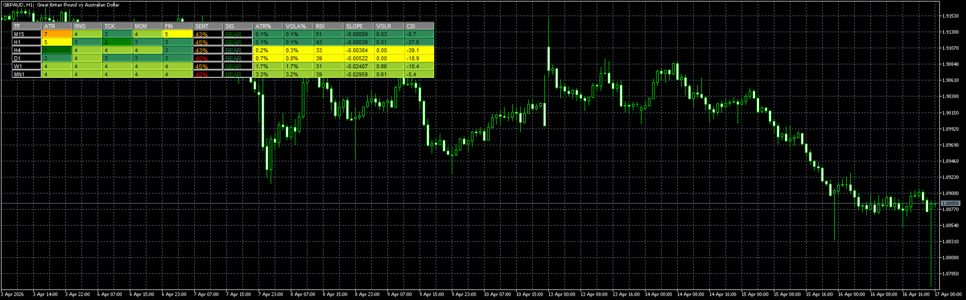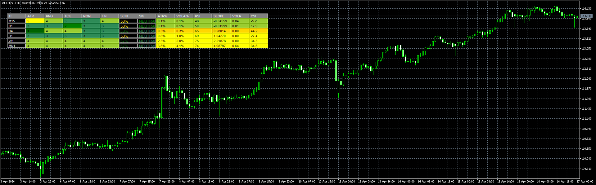 Dieses Tool gibt Ihnen einen sofortigen Überblick über die Marktbedingungen auf M15, H1, H4, D1, W1 und MN1 und hilft Ihnen, Umgebungen mit hoher Wahrscheinlichkeit für Trendfortsetzungen, Umkehrungen, Ausbrüche und Volatilitätsausweitungen zu erkennen.