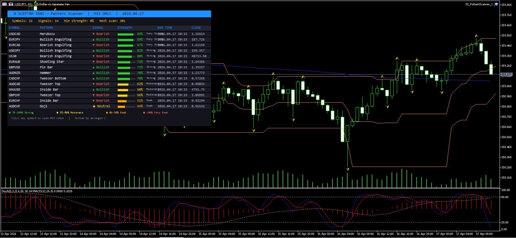 Der Scanner läuft mit einem konfigurierbaren Timer, der die OHLC-Daten für jedes Symbol in Ihrem Market Watch abruft und die komplette Mustererkennungs-Engine über jedes einzelne Symbol laufen lässt. Wenn Muster gefunden werden, wird jedes Signal anhand eines Algorithmus, der mehrere Faktoren berücksichtigt, auf einer Skala von 1 bis 100 bewertet - und nicht nur anhand einer einfachen Musterübereinstimmung. Die Ergebnisse werden automatisch aktualisiert und das Dashboard wird in Echtzeit aktualisiert.