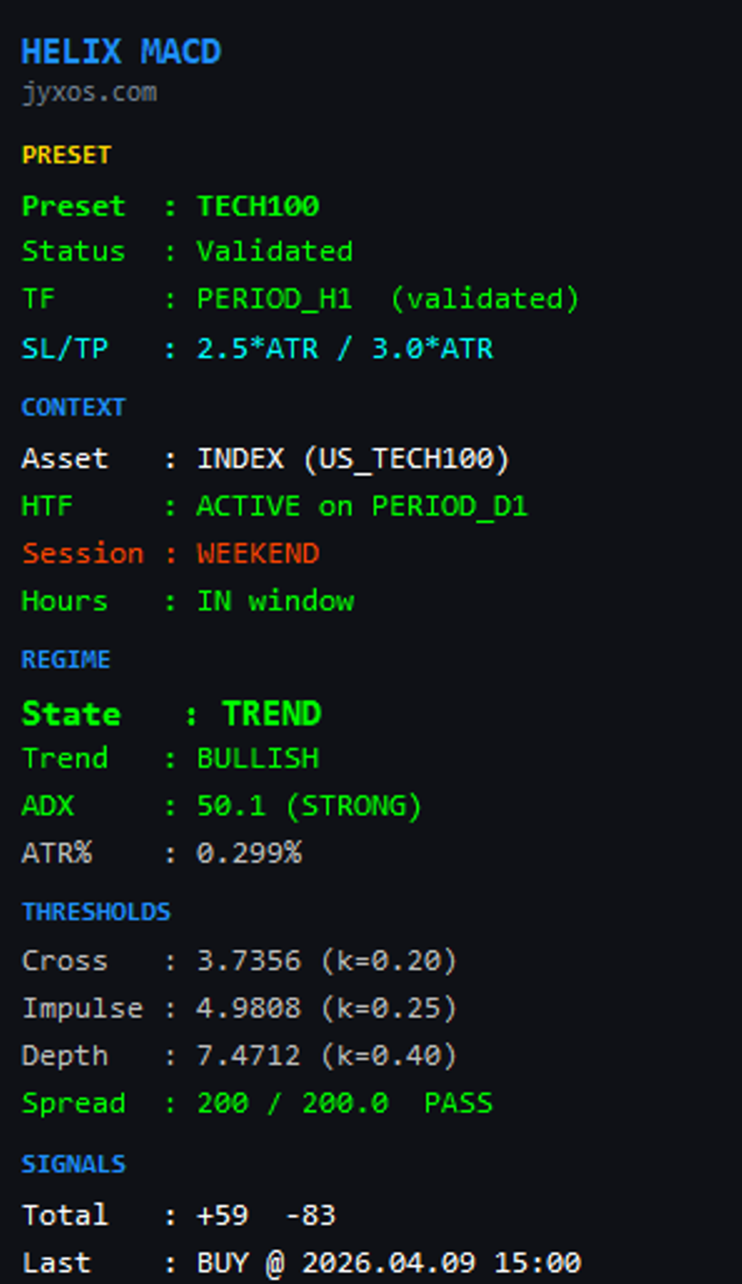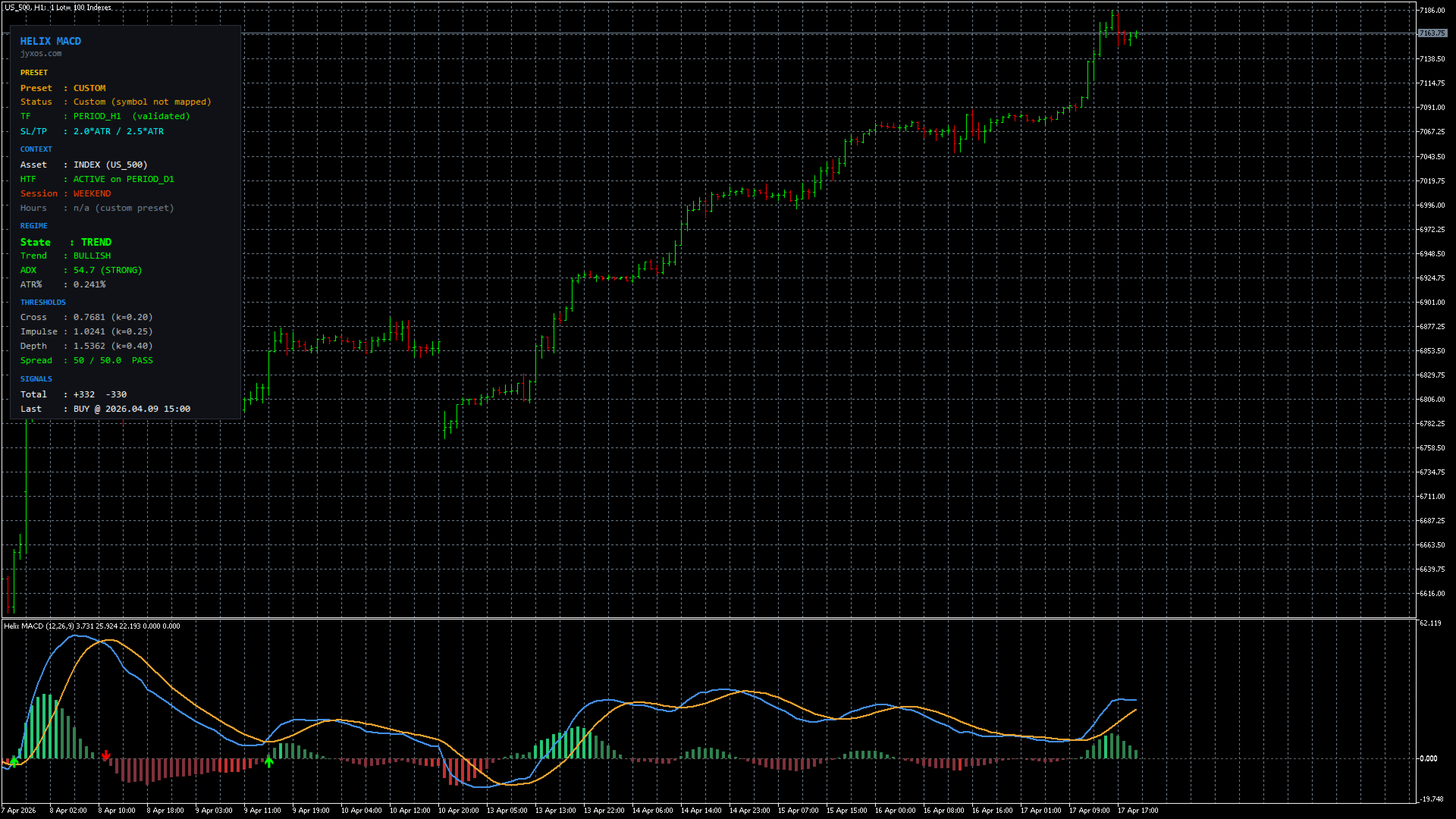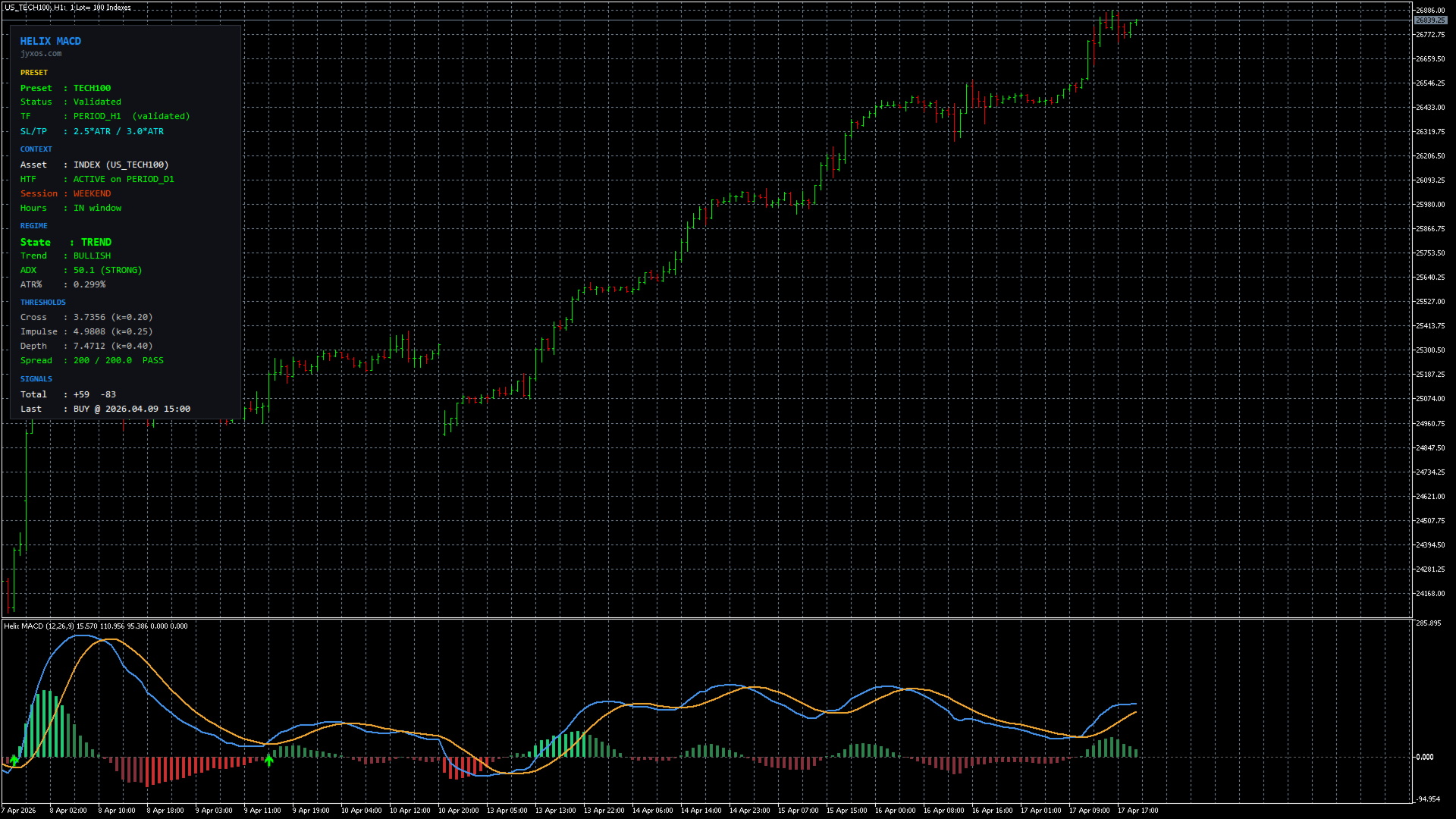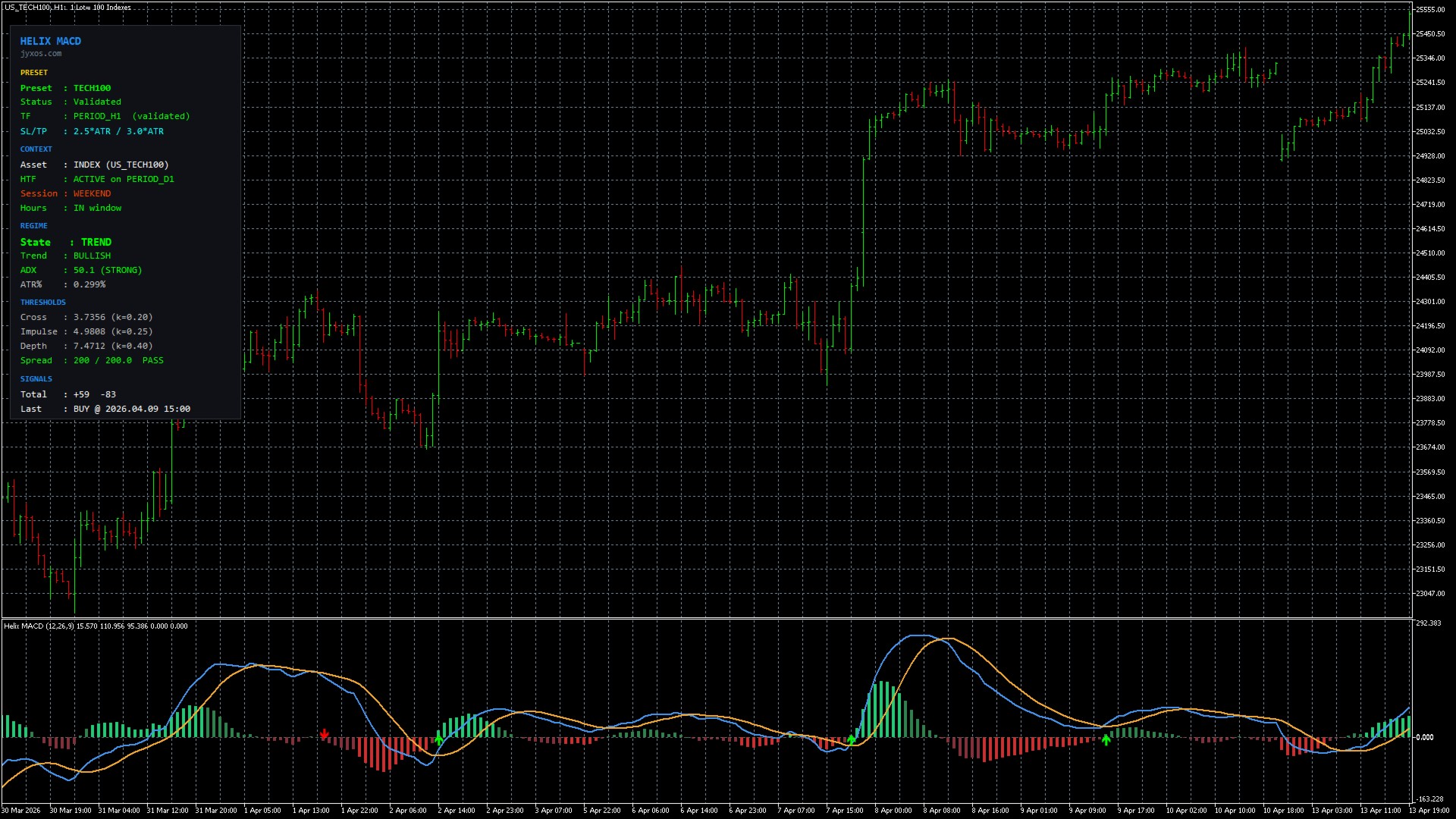 - Einrichtung: Legen Sie den Helix MACD auf einem H1-Chart mit einem der vier validierten Symbole an.
