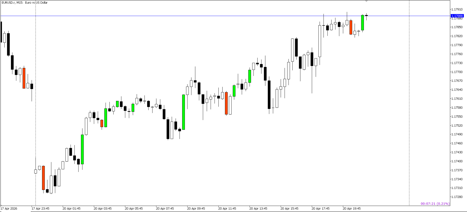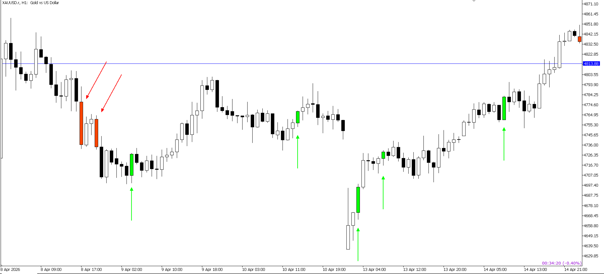 Wenden Sie den Indikator auf Ihren Chart an und suchen Sie nach hervorgehobenen Kerzen.