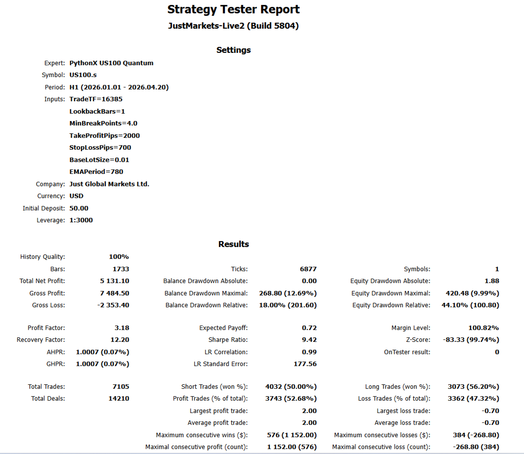 PythonX US100 Quantum ist ein hochpräzises Breakout-Handelssystem, das speziell für den US100 (Nasdaq 100 Index) entwickelt wurde. Es basiert auf der Marktstruktur und der Trendausrichtung und konzentriert sich auf das Erfassen von starken Richtungsbewegungen und nicht auf verrauschte Scalping-Setups.