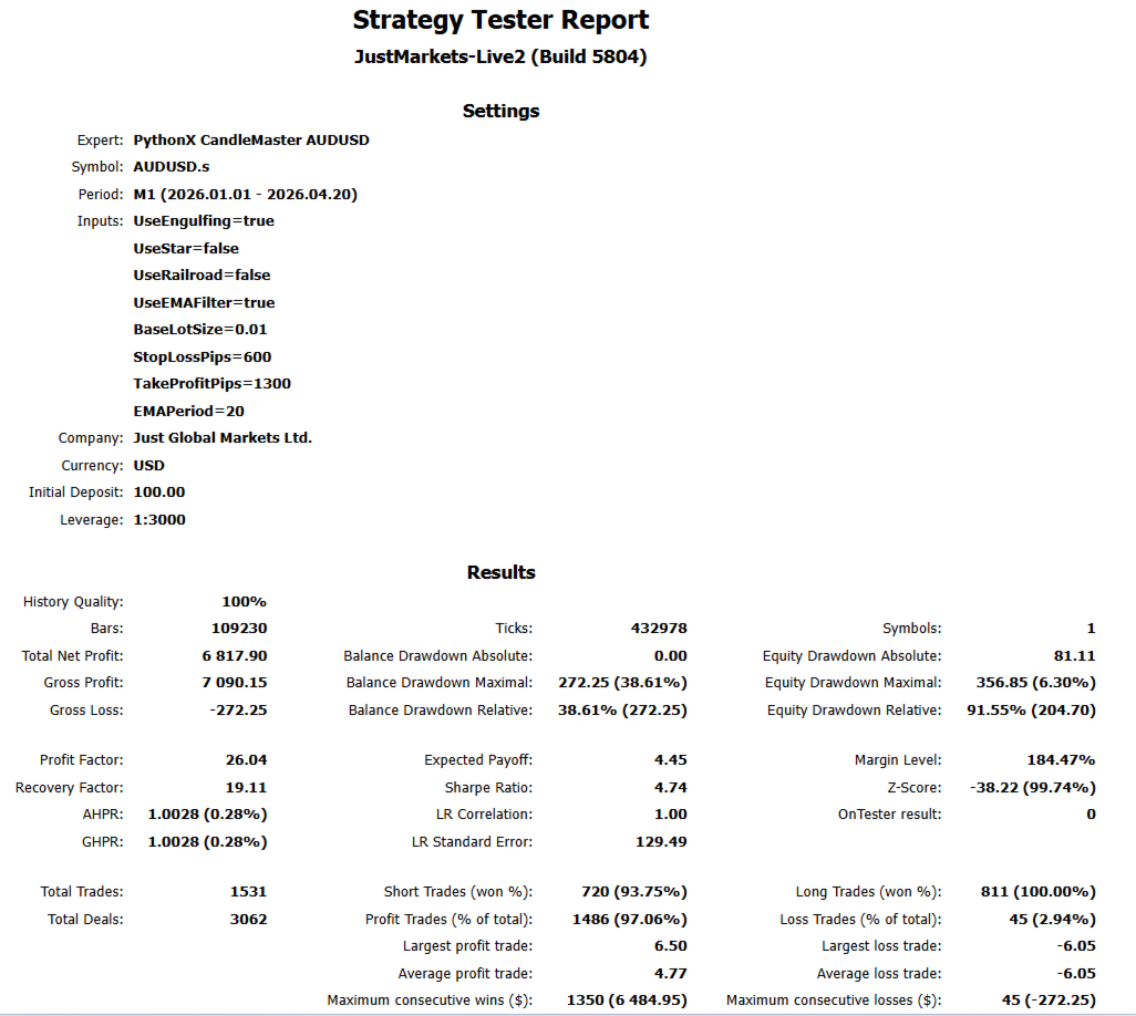 PythonX CandleMaster AUDUSD ist ein preisaktionsgesteuerter Expert Advisor, der speziell für das Währungspaar AUDUSD entwickelt wurde. Das System kombiniert einen trendfolgenden EMA-Filter mit der Erkennung von Candlestick-Mustern mit hoher Wahrscheinlichkeit, um Trades mit Präzision auszuführen.