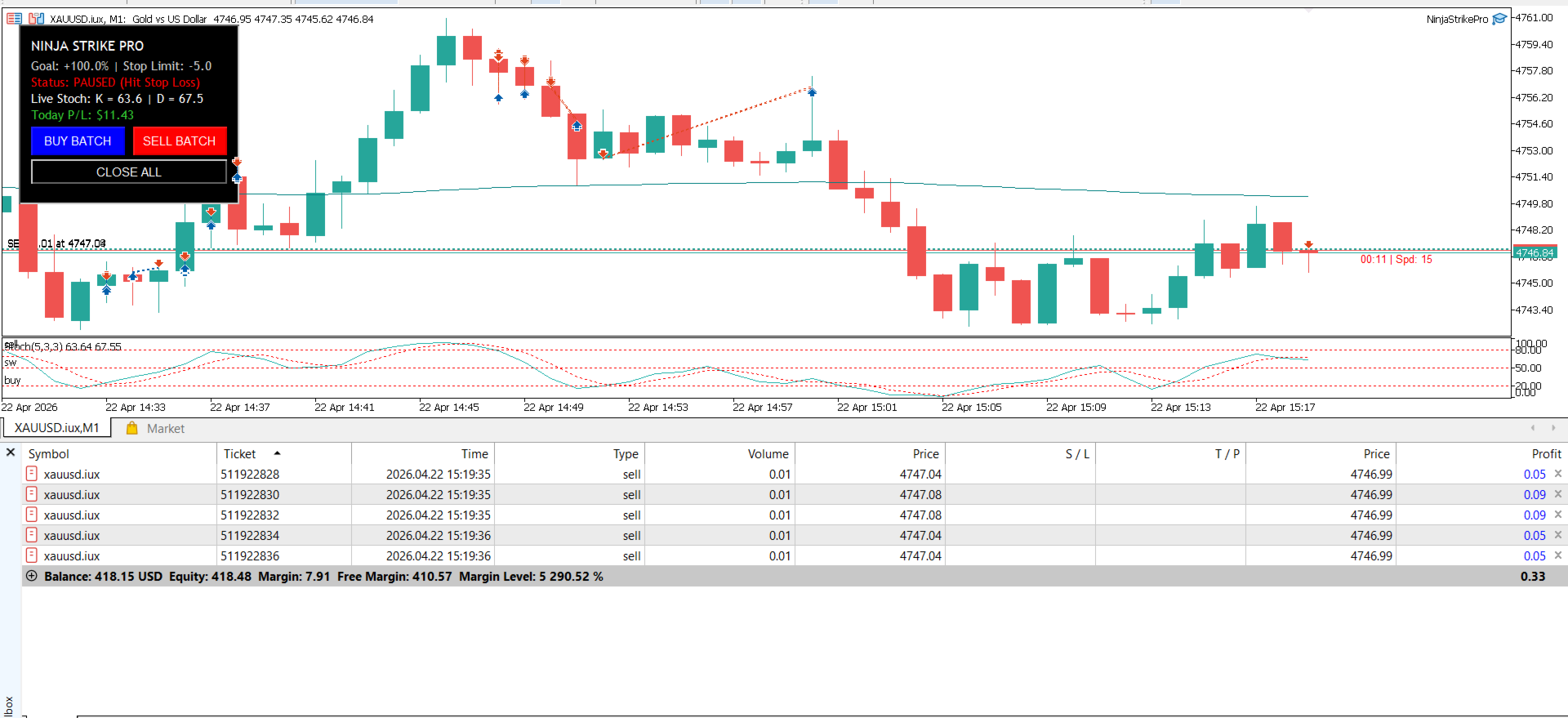 Trend Riding: Sobald ein Handelskorb den Take Profit erreicht, überprüft der EA das Momentum. Wenn die nächste Kerze die gleiche Farbe beibehält (z.B. immer noch grün nach einem Buy TP), löst er sofort eine weitere Reihe von Aufträgen aus, um den Trend mitzunehmen", ohne darauf zu warten, dass die Stochastik zurückgesetzt wird.