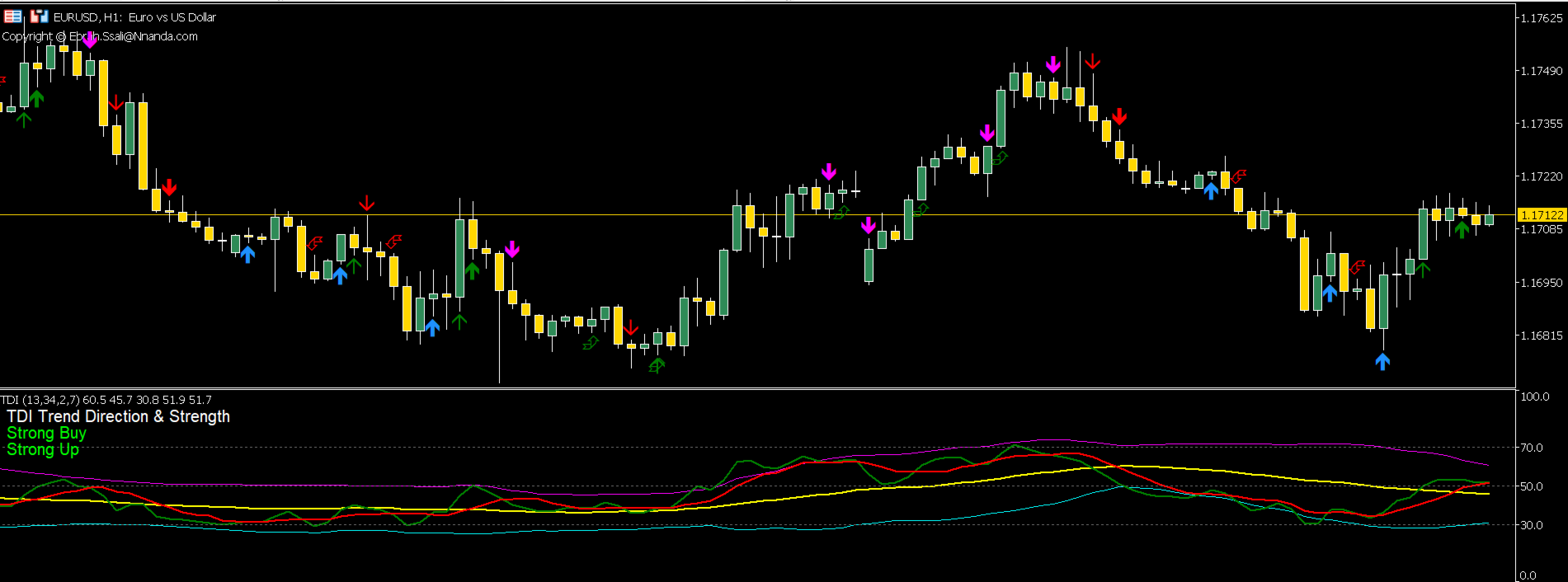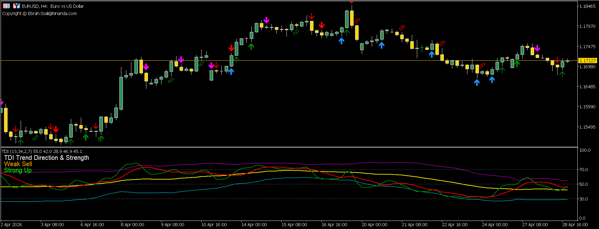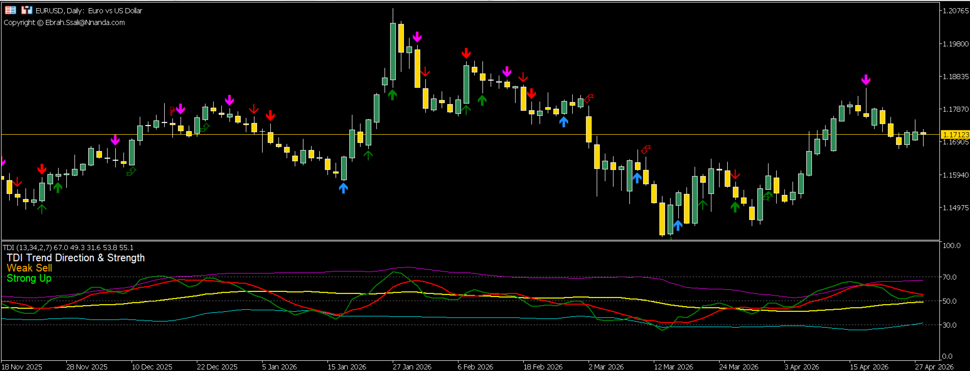 Visuelle Signalobjekte: Gut sichtbare Pfeile werden auf dem Chart generiert, um das manuelle Backtesting und die Identifizierung von Trades zu unterstützen.