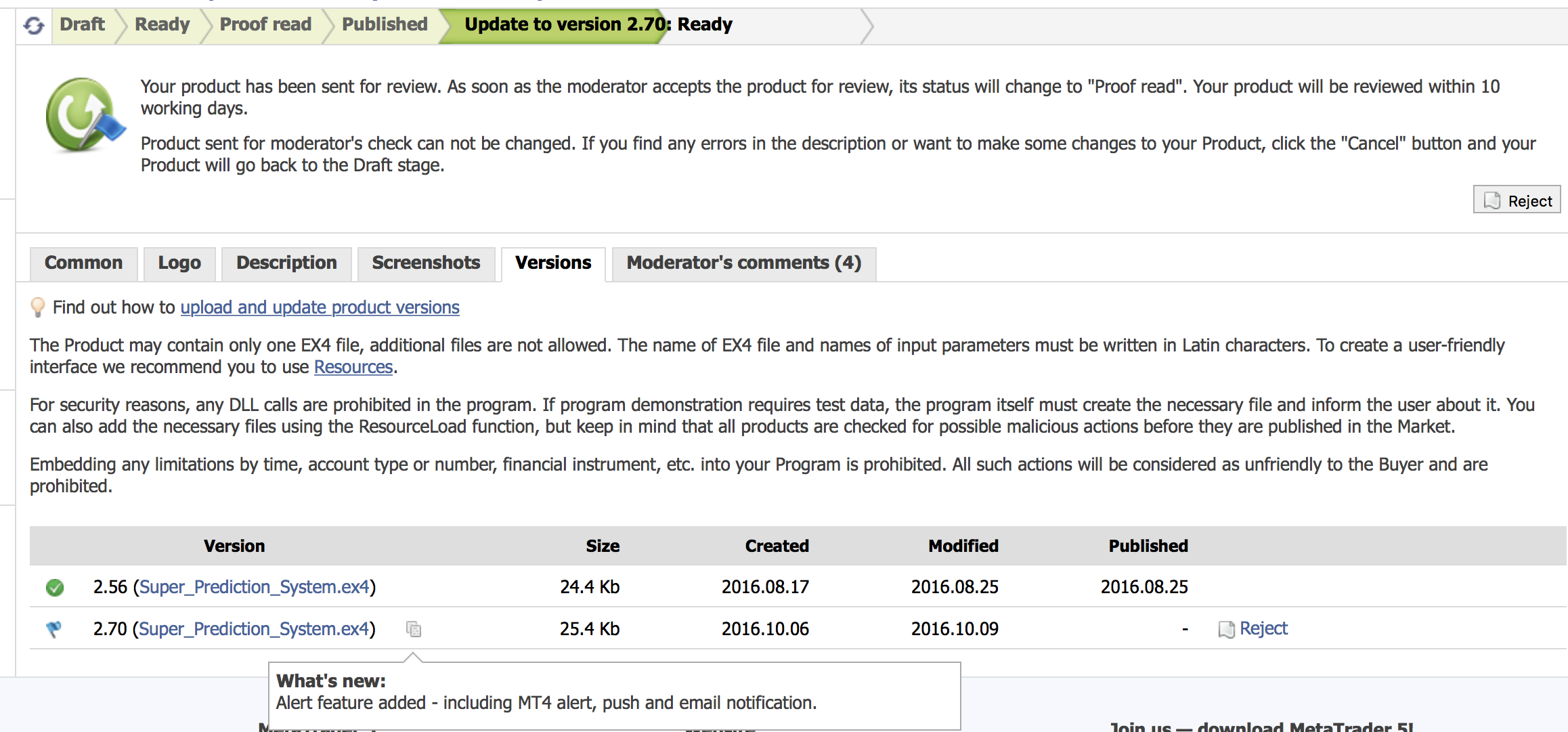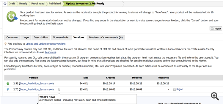 Below you can see that the indicator with the alert feature is pending for approval. As soon as it will be approved, you will have it available in your MT4.