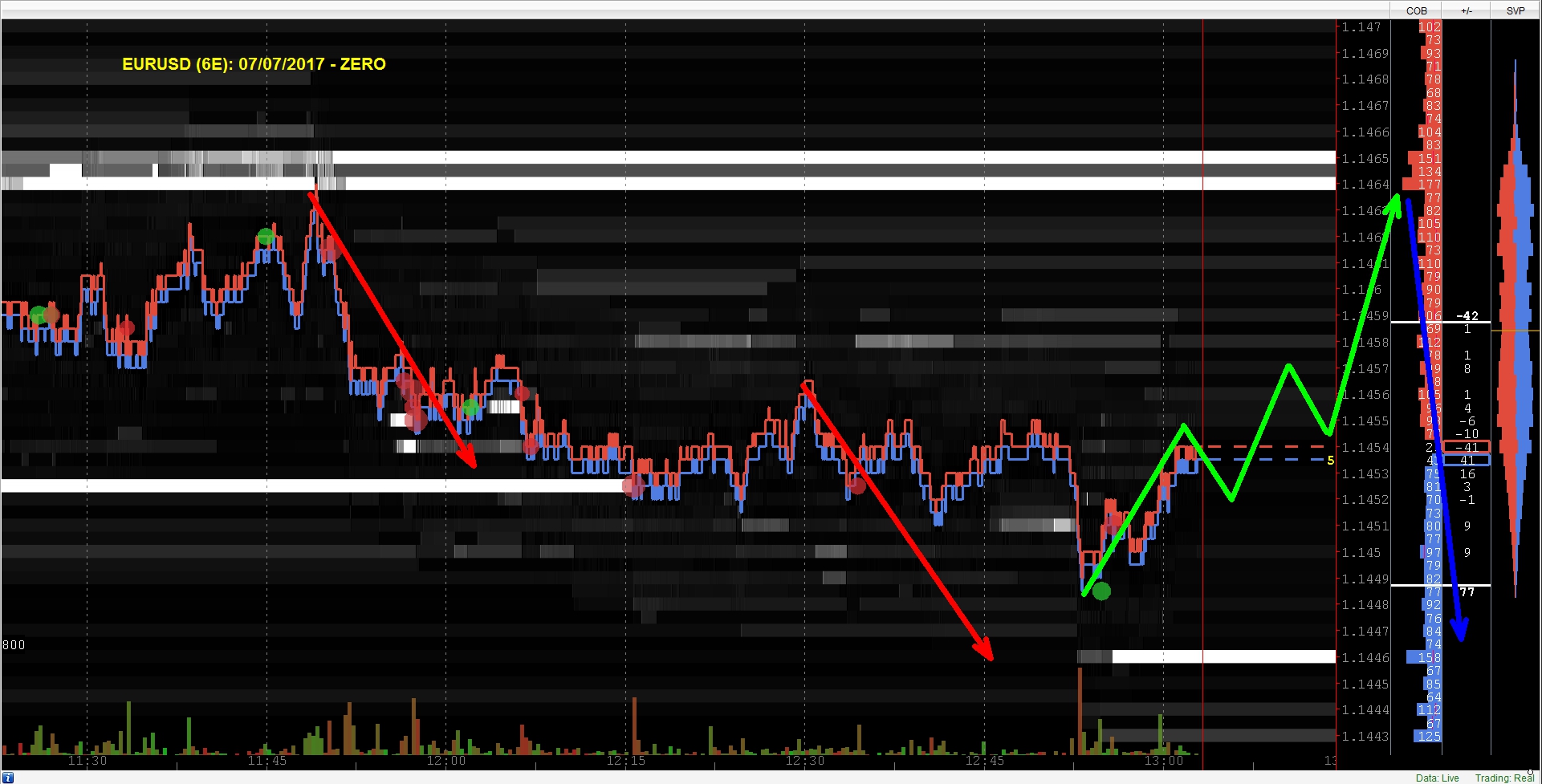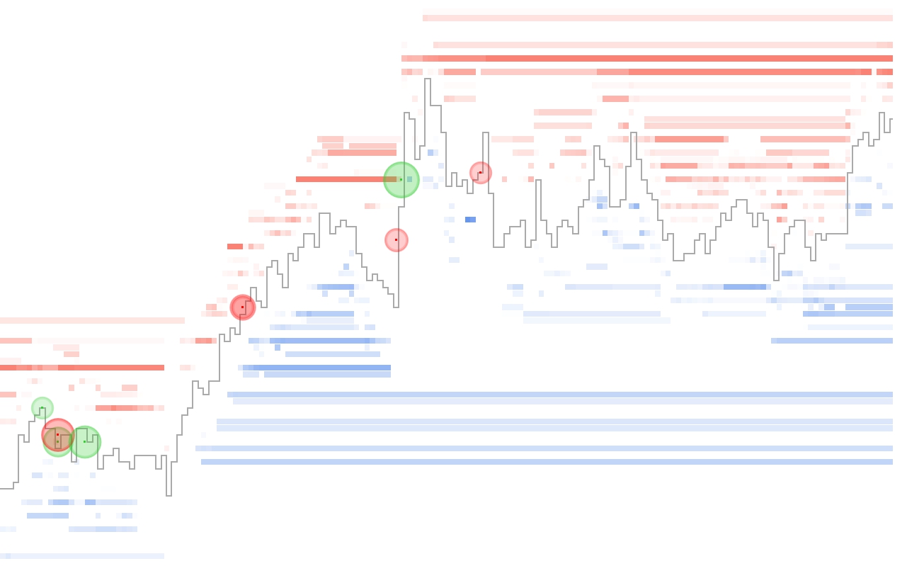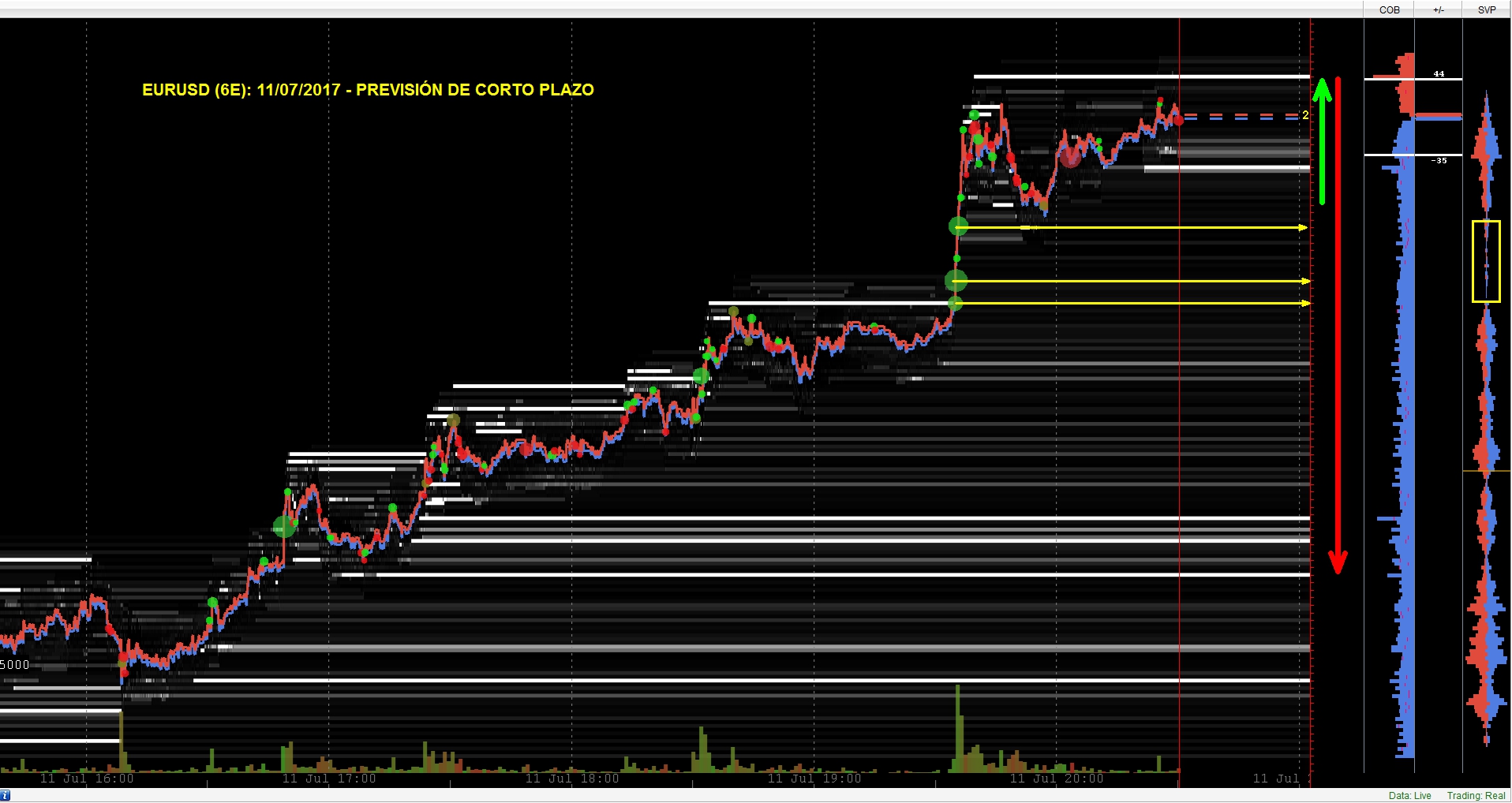 Después de este comenterio, decir que a primera vista, lo que nos llamará la atención son "zonas" donde vemos una gran cantidad de órdenes acumuladas (serían zonas de Soporte/Resistencia). Una vez detectadas estas zonas, es cuando vemos el comportamiento distinto de los algoritmos. En ocasiones veremos que ejercen de "barrera" y los algorítmos huyen de esas zonas hacia otra zona de precios, pero en otros intrumentos como el EURUSD, veremos que tiene tendencia a ir a buscarlas y devorarlas. Son algorítmos programados para buscar liquidez.