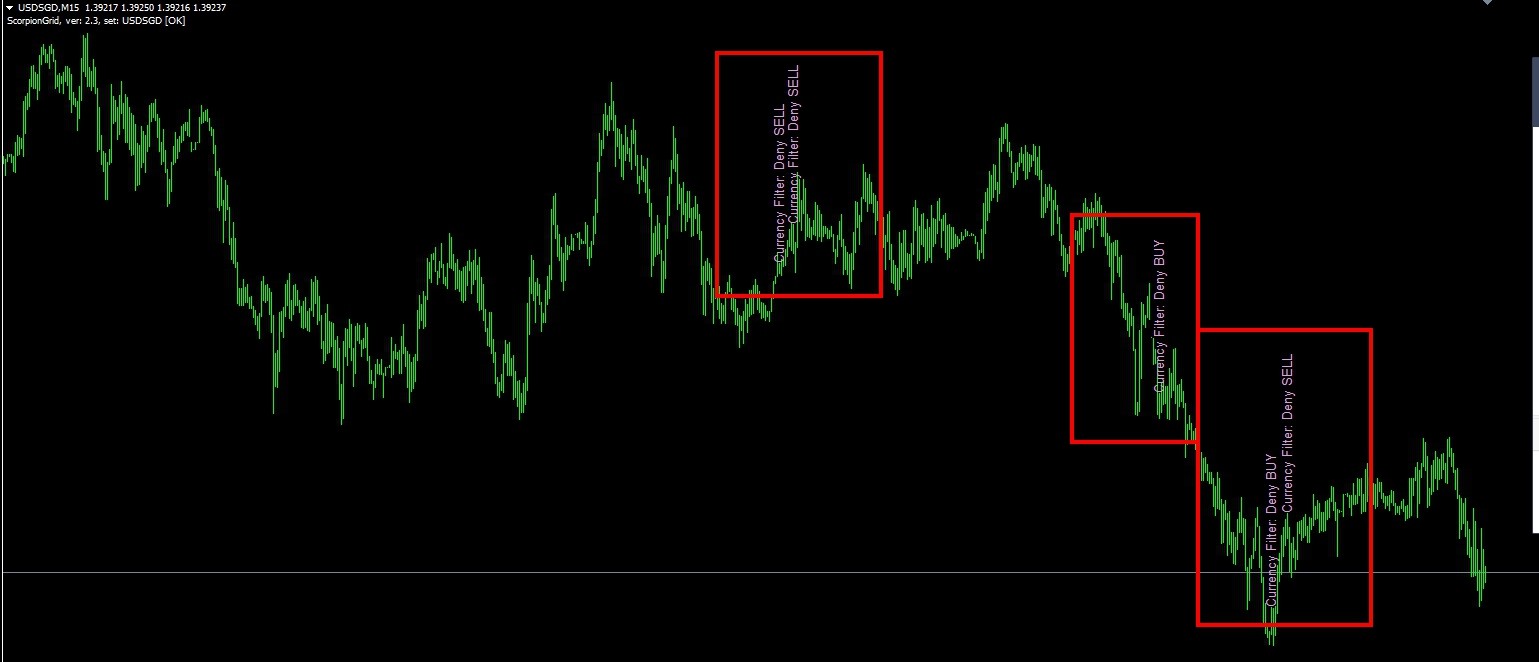 CurrencyFilter – a filter of trade opening on a currency, if there are trades in this direction on this currency. For example, we have a open Buy trade of EURUSD, then we freeze opening of trades on other currency pairs containing on the EUR - Buy trades, and containing USD - Sell trades.