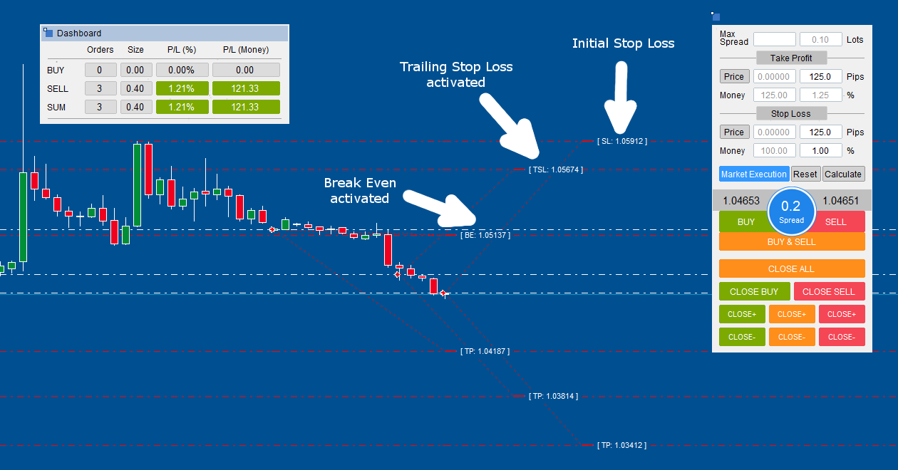 I added Break Even and Trailing Stop Loss to the new version of Trade Manager 4 and you can see on the chart if Break Even (BE) or Trailing (TSL) was triggered.