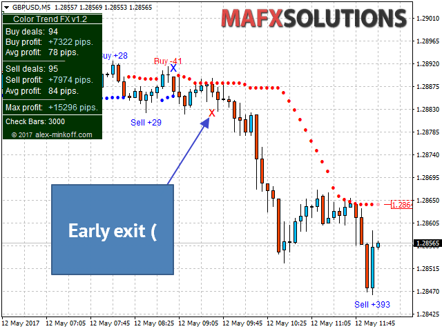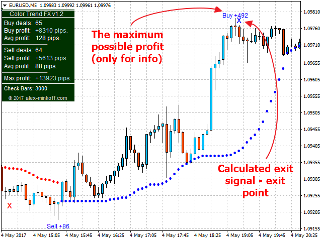 From manual: Indicator shows on the chart the accurate market entry points, accurate exit points, maximum POSSIBLE profit of a deal (for those who take profit according to their own system for exiting deals)...