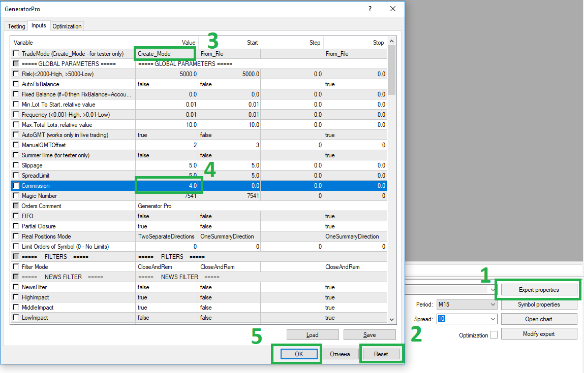 3. Choose Create_mode and set the Commission 4, because we will use the server with the Commission 4 on EURUSD. (Выберем Create_mode и установим комиссию 4, т.к. мы будем использовать сервер с комиссией 4 на EURUSD)