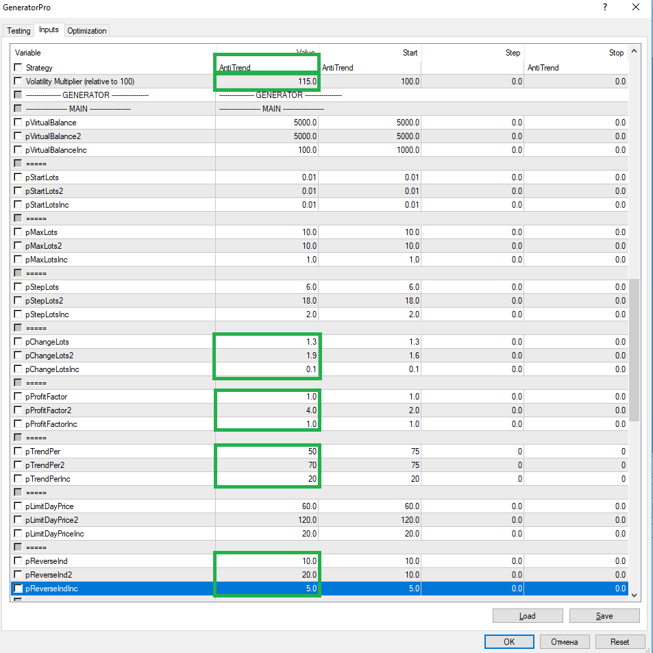Generator Pro имеет несколько видов алгоритмов (Trend, AntiTrend, TrendAndAntitrend), а также множество свойств, меняющие вид алгоритма (виртуальный разворот; динамические уровни; ждать следующий бар для открытия; ждать следующий бар для закрытия; зафиксировать расстояние для закрытия; нормализовать лоты; усреднять в обе стороны; усреднять в направлении тренда; усреднять от верхних (нижних) позиций; разворачивать позиции при прибыли >= 0; все убытки помещать в ExtraRecovery; закрывать позиции, если достигнуто значение Delta; перевернуть индикатор первой позиции; выбор направления)