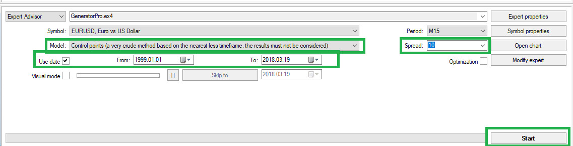 (Создание стратегий будет проводиться на Pro-ECN сервере, плечо 1:500, средний спред EURUSD - 5, комиссия - 4. Мы установим спред чуть больше - 10. Выберем период с 1999 года и контрольные точки для быстрой работы. И нажимаем Start.)