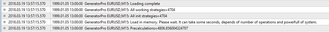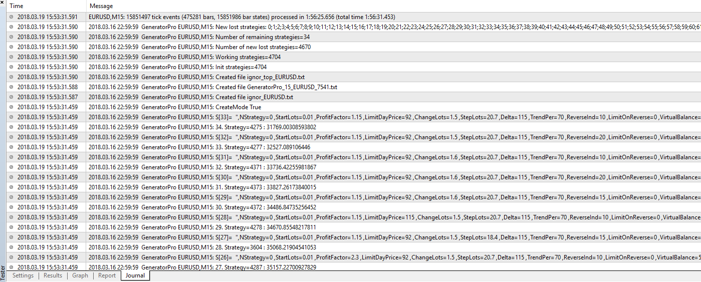 After 1 hour 56 minutes the process was over. We see that there are 34 strategies left, all their parameters are placed in the file GeneratorPro_15_EURUSD_7541.txt. And also created two more files ignor_top_EURUSD.txt, ignor_EURUSD.txt. These files contain information about which policies have been excluded from the work. They may be necessary if you want to continue optimization after some time (for example, six months), again not to spend 2 hours.