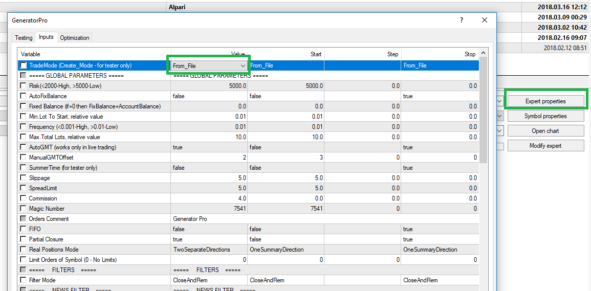 1) Перед установкой советника на график, проверьте период графика, название символа, а также MagicNumber - они должны совпадать с названием фала. GeneratorPro_PP_XXXYYY_1234.txt (где PP - период в минутах, XXXYYY - валютная пара, 1234 - Magic Number)