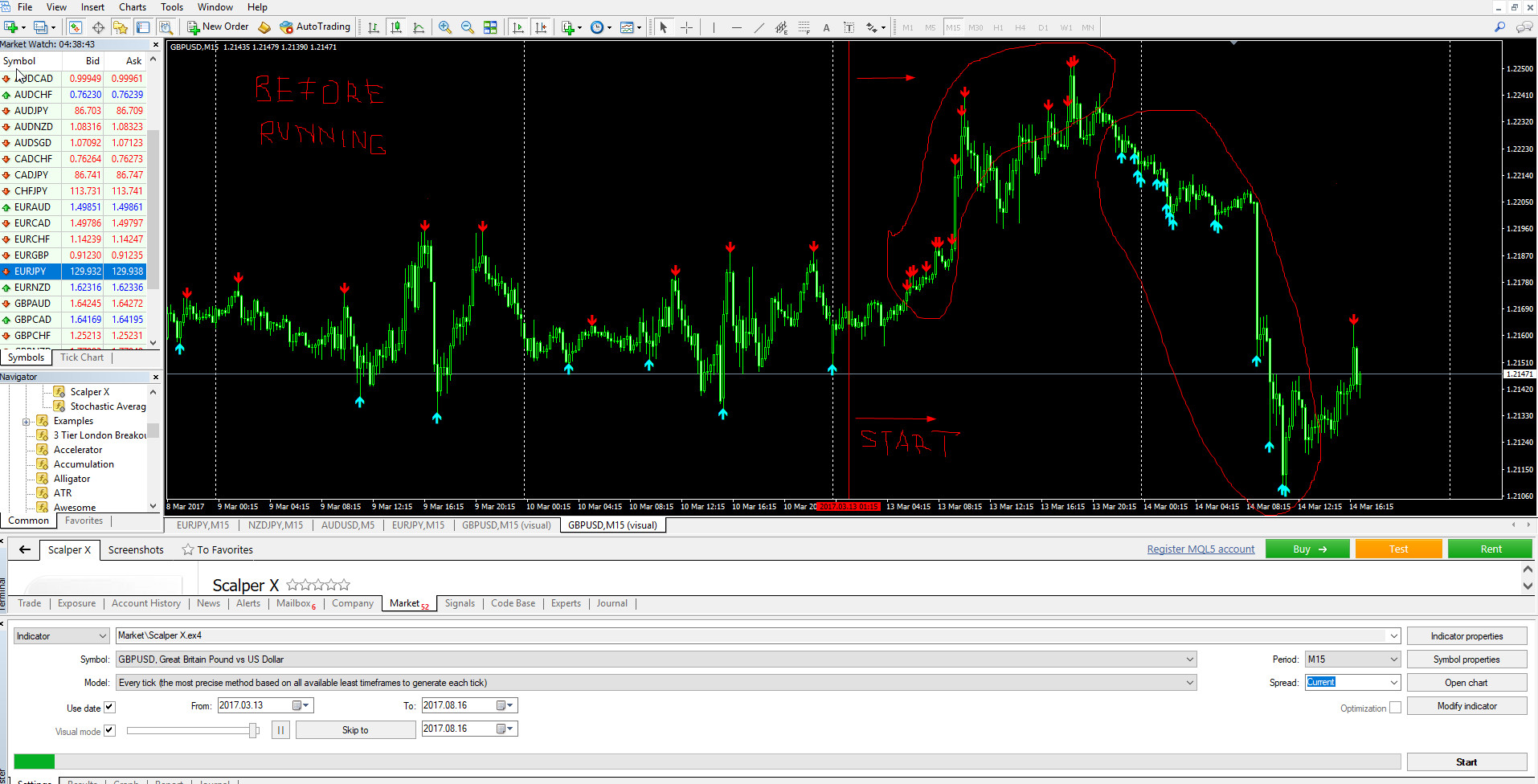 in the strategy tester when it's start running the arrow doesn't look like the pic before running,