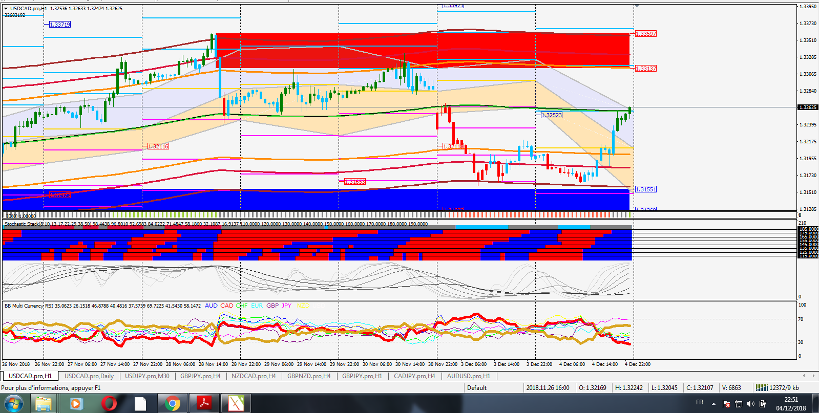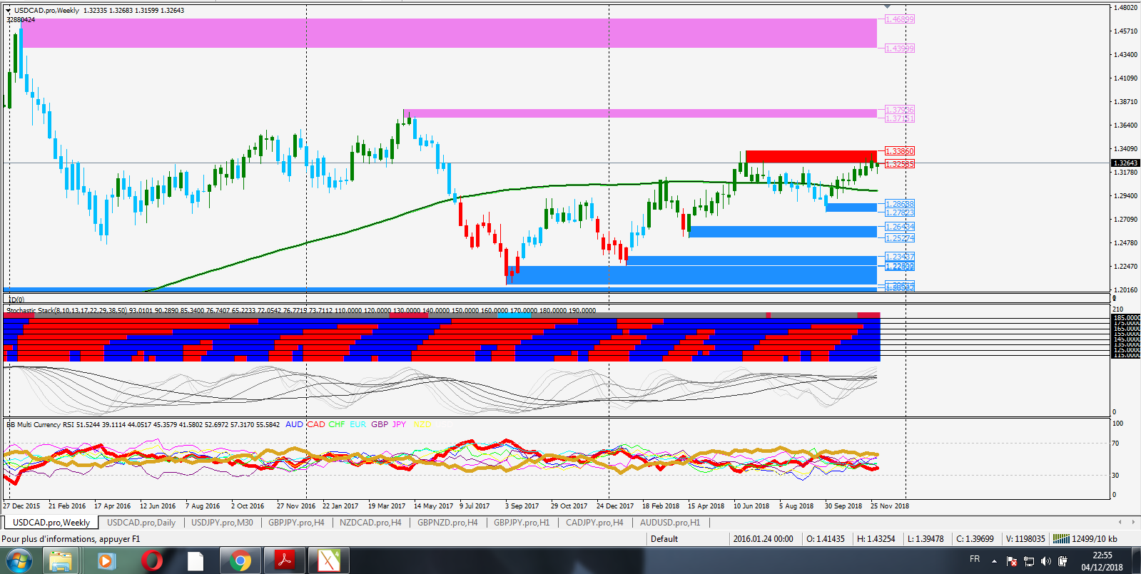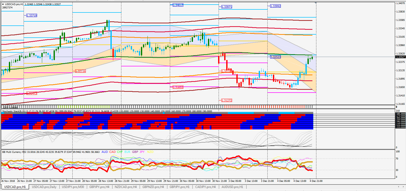 Right now CAD is the weakest currency according to Multi-Timeframe analysis. NZD, JPY and USD are among the strongest. NZDCAD and CADJPY have already move a great deal outside the channel, so I would rather choose USDCAD for a trade, if I had to take one immediately. The price for USDCAD is about to break the pivot channel of the indicator (Classic Formula #1). According to the experience I have about the indicator (testing it live during the past few months) this trade has a better chance to be a winner rather than a loser.