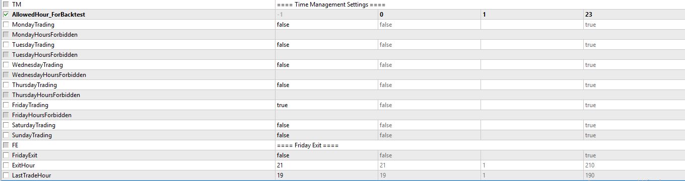 Hello again, I just published a new version 1.4 of Smart Scalper PRO. I have fixed a small bug related to this parameter: AllowedHour_ForBacktest. Now it should work as explained here: this parameter is only for backtesting! It helps optimizing the Time Management system. Here is how you can use it. During the optimization set start value 0, end value 23 and the step 1. You can optimize only one day per optimization. For example you want to optimize the forbidden hours for Monday, you have to disable other days bay settings TuesdayTrading=false ... to ... FridayTrading=false. At the end of the optimization the tester will show you the best hours for trading on Monday. You can add the bad hours in the parameter MondayForbiddenHours separated by comma, for example: 1,4,6.