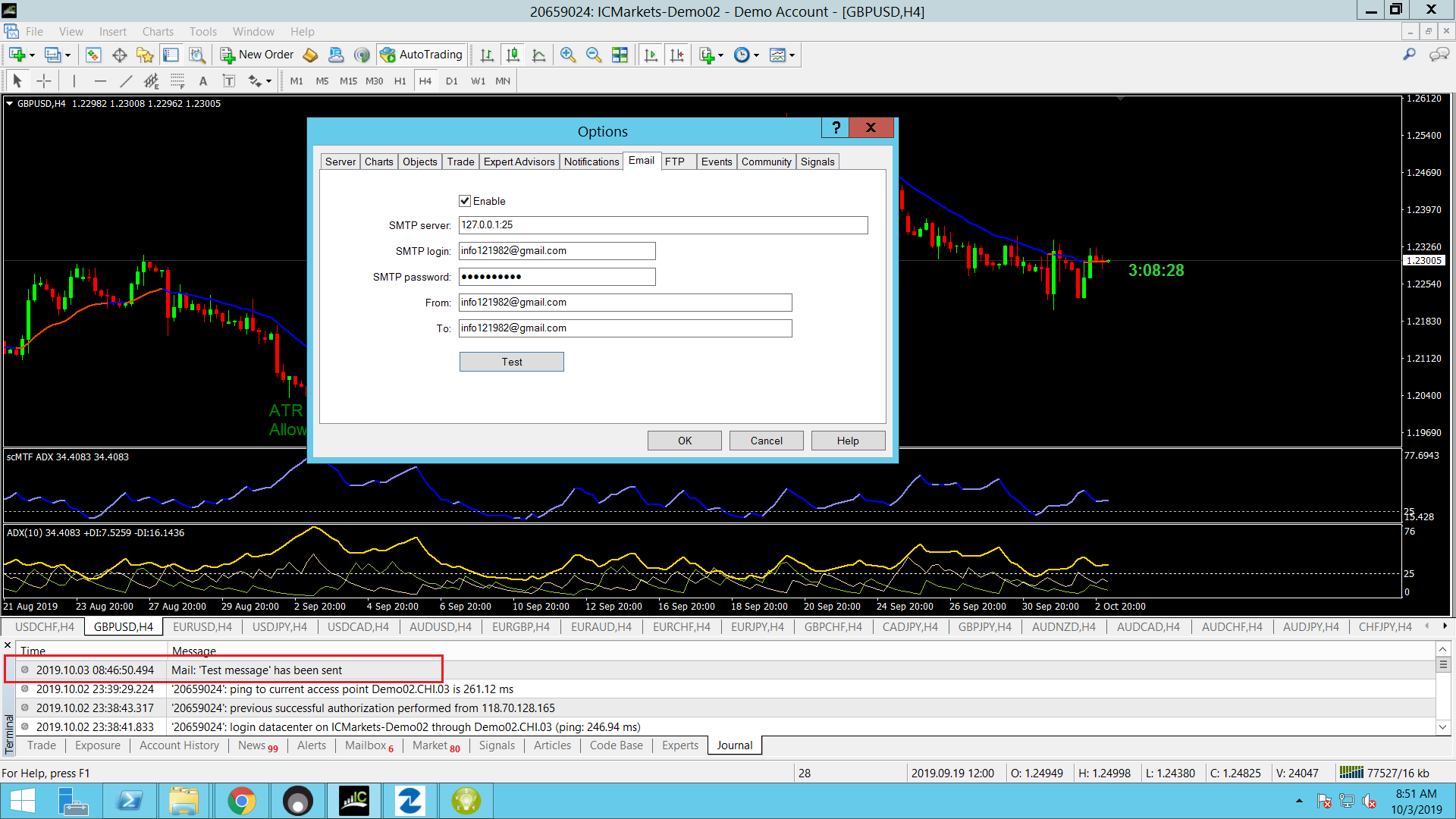 I tested this indicator on demo account, when price passed MA line, but I not see any alerts or email. I configured send alert (tested on MT4 is ok) via email but not see any.