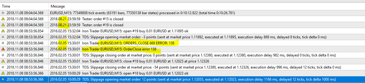 Hi, attached data for investigation. Test was done with TDS2, variable spread, M15 , EURUSD. It was error 138 during the closure request, that was failed. After that EA did't try to close position again, and these stay opened forever, till end of the test.
