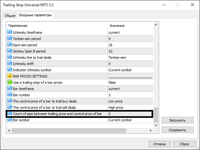 В настройках появился новый параметр: "Count of pips between trailing price and control price of bar".