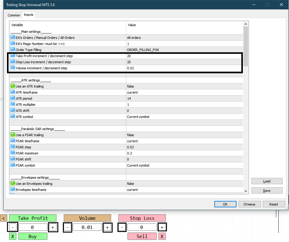 1. В настройках теперь можно выбирать ордера для трейлинга: ручные ордера, ордера советника, все ордера.