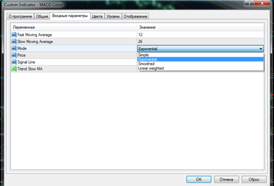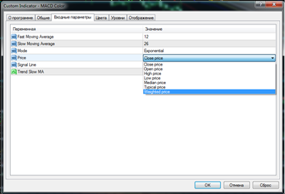 1. А это значит, что параметры индикатора : метод усреднения и тип цены выведены в окно свойств, чего не было в прежней версии, благодаря чему появилась возможность наблюдать схождение/расхождение не только экспотенциальных скользящих по цене закрытия (как в стандартном индикаторе) , но и менять эти параметры в настройках с помощью выпадающего меню выбора параметров
