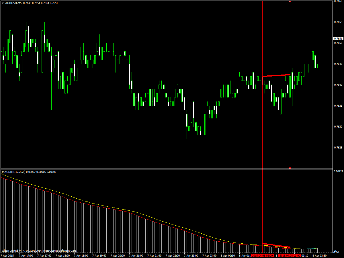 Попробуйте MACD Converter, он дает оповещение о расхождении на последнем баре, правда линий не рисует. Но зато при уменьшении ТФ - сохраняет параметры настроек, т.е. получили сигнал на последнем часовом баре, перешли на 15 или 5 минут - и работаете... Какой ТФ установите в свойствах индикатора, такой и будет на младших ТФ, слева в окне индикатора MACD(H1.12.26.9)