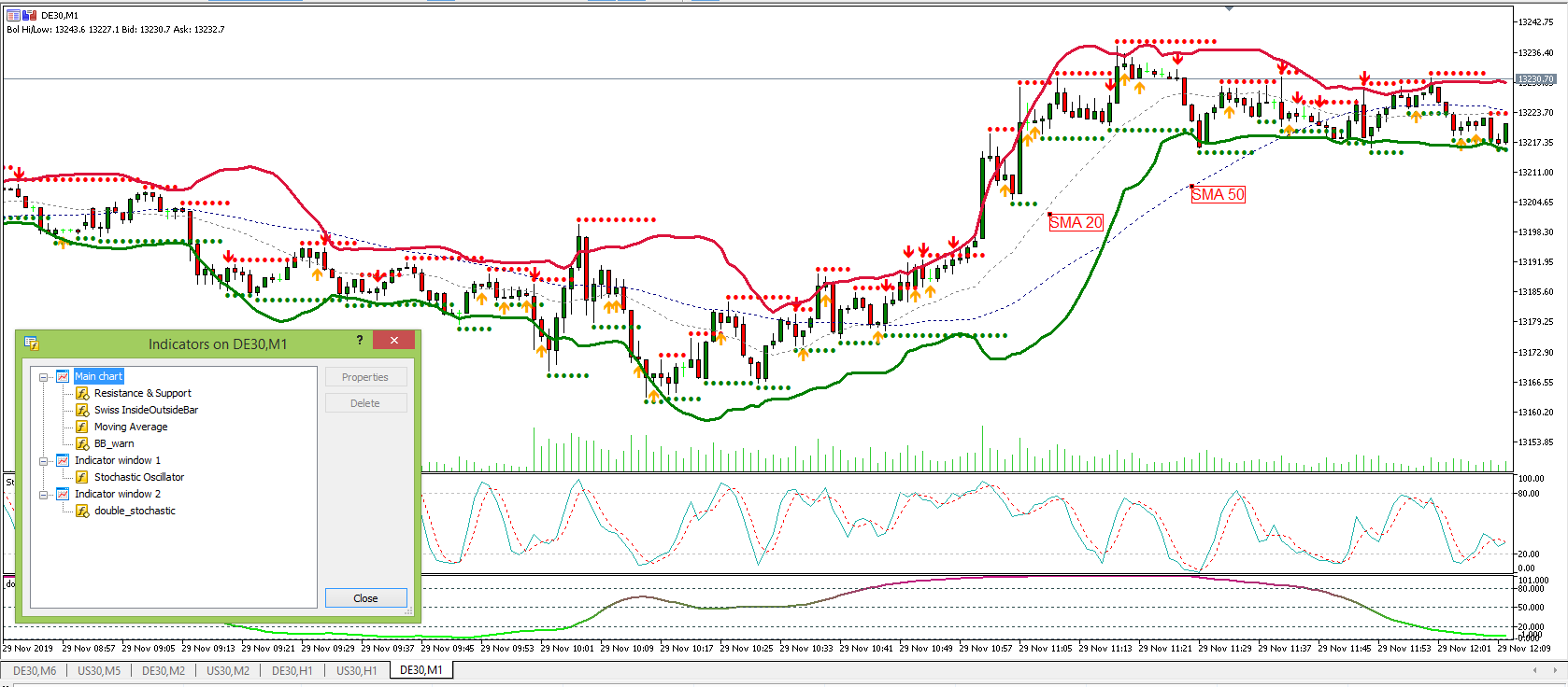 Look at Inside- and Outside Bars near upper or lower Bollinger-Bands. Bearish engulfing patterns at the upper Bollinger is a short signal and bullish engulfing at the lower Bollinger a long signal. The Simple Moving Average 50 shows the global trend. The SMA 20 is the middle line of the Bollinger Bands. Unfortunately the occurence of inside und outside bars is dependent on timeframe (here M1).