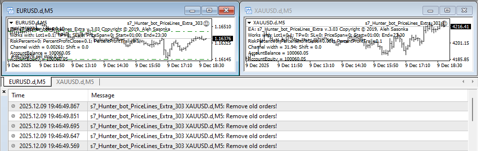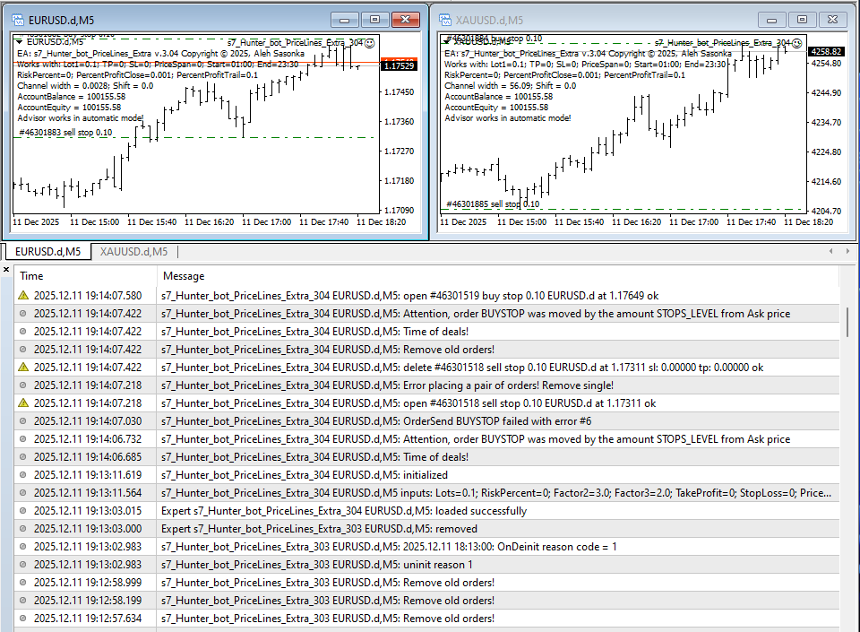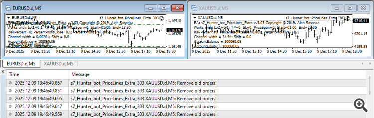 Only when the orders on the first chart ( XAUUSD ) close will a new pair of orders open on the second ( EURUSD ). The "Remove old orders!" error will appear on the XAUUSD chart.