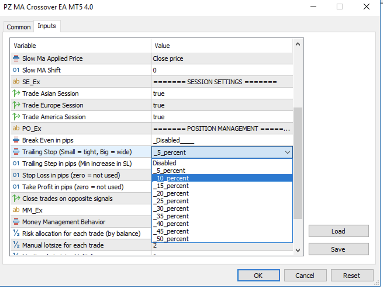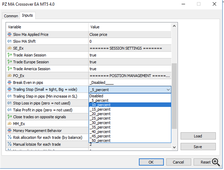 Please change the trailing stop from percentage to the standard method.