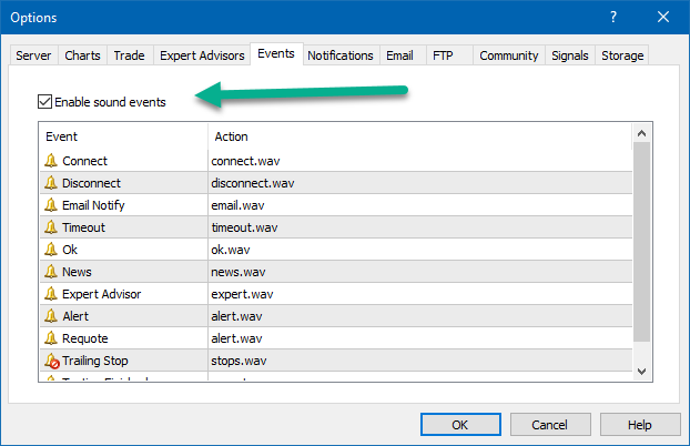 Please ensure you have checked "Enable Sound events" in the "Events" tab of the "Tools / Options..." menu