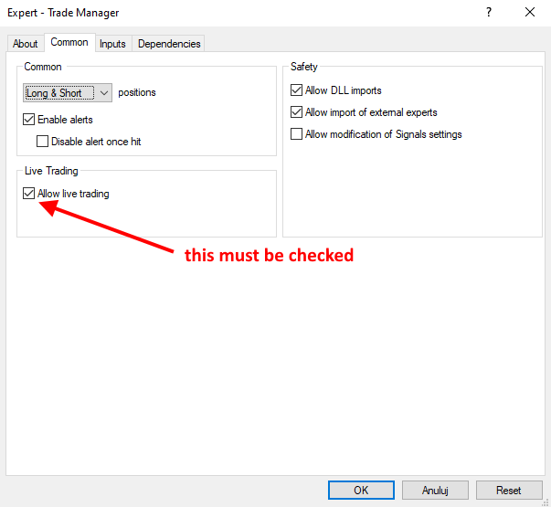 Hi, with the MT5 when i press F7 nothing happens. I had to put Trade manager on and then press F7. Then the properties box popped out with this. By selecting allow algo trading that seemed to fix the problem. However, I discovered another problem when trying to modify existing trades. This error box always appears. Please help.