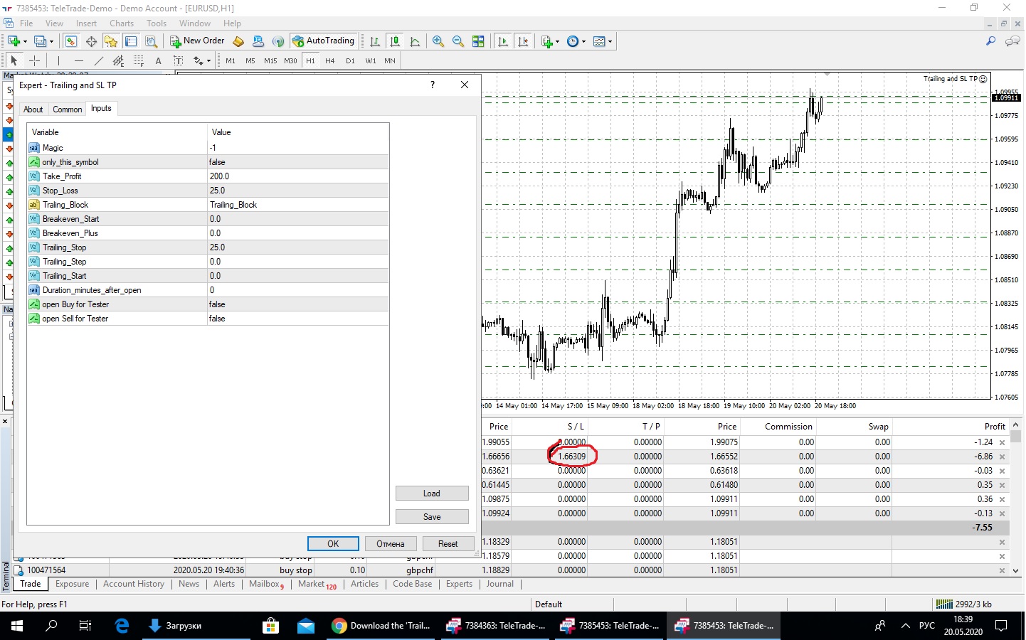 Взял в оренду комп у "Microsoft Azure", чтоб тестить роботов. Первых 2-3 сделки он ставил SL и TP, а далее молчит. Операции были и мои и другого робота. Сам менял SL и TP - все меняется (обвел красным). Запускал тот же счет на другом терминале на чистом графике, все равно утилита молчит