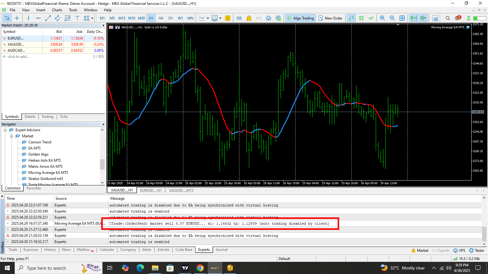 I am talking about the effort of the Moving Average EA MT5 to open a 8.87 sell EURUSD trade that gave that 'auto trading disabled by client' error message, wihin the red box.