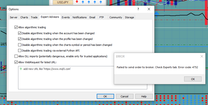 Hi, I get the same error code: 4752 whenever i try to place a marked order, I have no problem with penting orders. Did the same settings in Options under Expert Advisors as User: 84380, but can't seem to find your solution on mt5. Can you maybe send a screenshot of were to enable it on the expert advisor level? Thank you