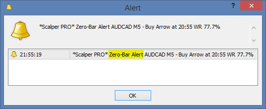 When the 'Closed Bar [0]' is activated, the custom indicator connected to the Scalper Inside Pro indicator gives a pre-alarm on the current bar: