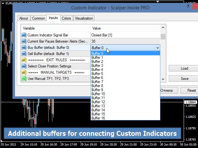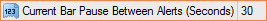 When using Custom Indicators and activating the signal receiving mode on the Current (Zero) bar, the pause parameter in seconds is added to exclude the constant triggering of the signal:
