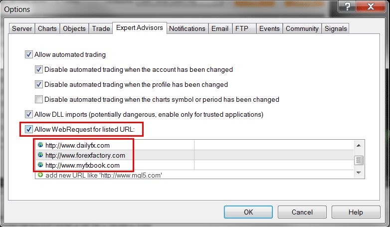 This error code indicates that you have not yet add the data source URL in your MT4. The tool need the permission to connect to the websites in order to get the data from there. Please add the URL of data source that you want to get news from as follows: