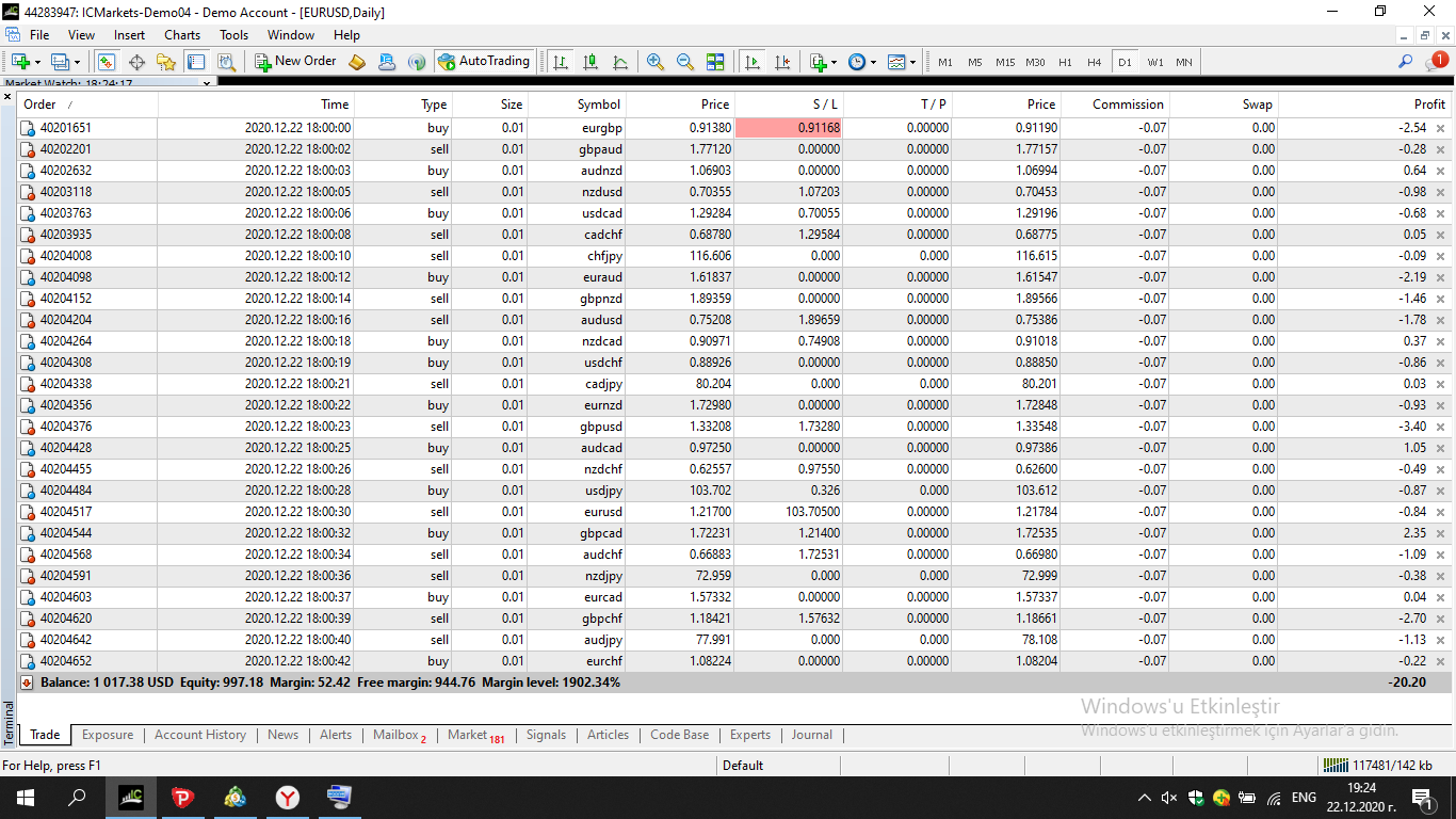 Запустил советника. Стоит молчит ничего не происходит. Черный экран, что то сканирует. Что он должен показать , когда работает? В эксперте тишина нет никаких записей. 2020.12.16 12:39:14.551 Project Tiptop EURUSD_i,Daily inputs: MM1=5000.0; BaseLotSize=0.01; StopLoss=300.0; Amode=200.0; TrailStopPts=5.0; Target=0.5; MarginLimit=2000.0; CycleTarget=0.5; StartTime=9; EndTime=22;