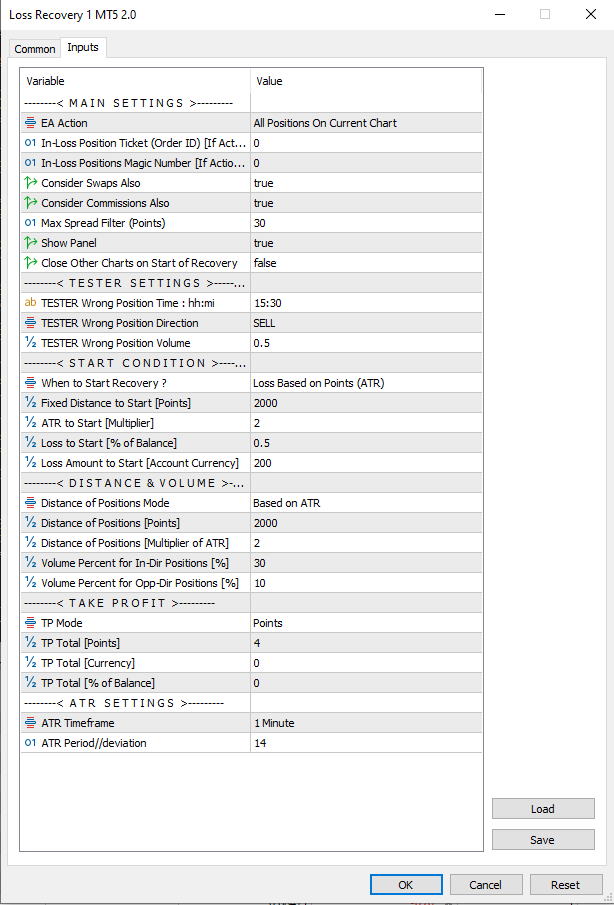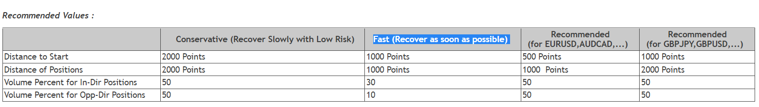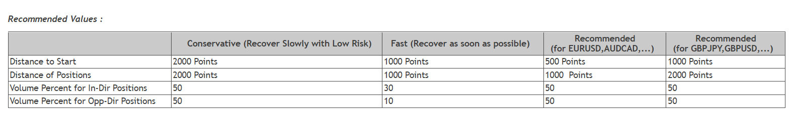 My recommendation for EURUSD is 500,1000,50,50 and for GOLD : 10000,20000,50,50