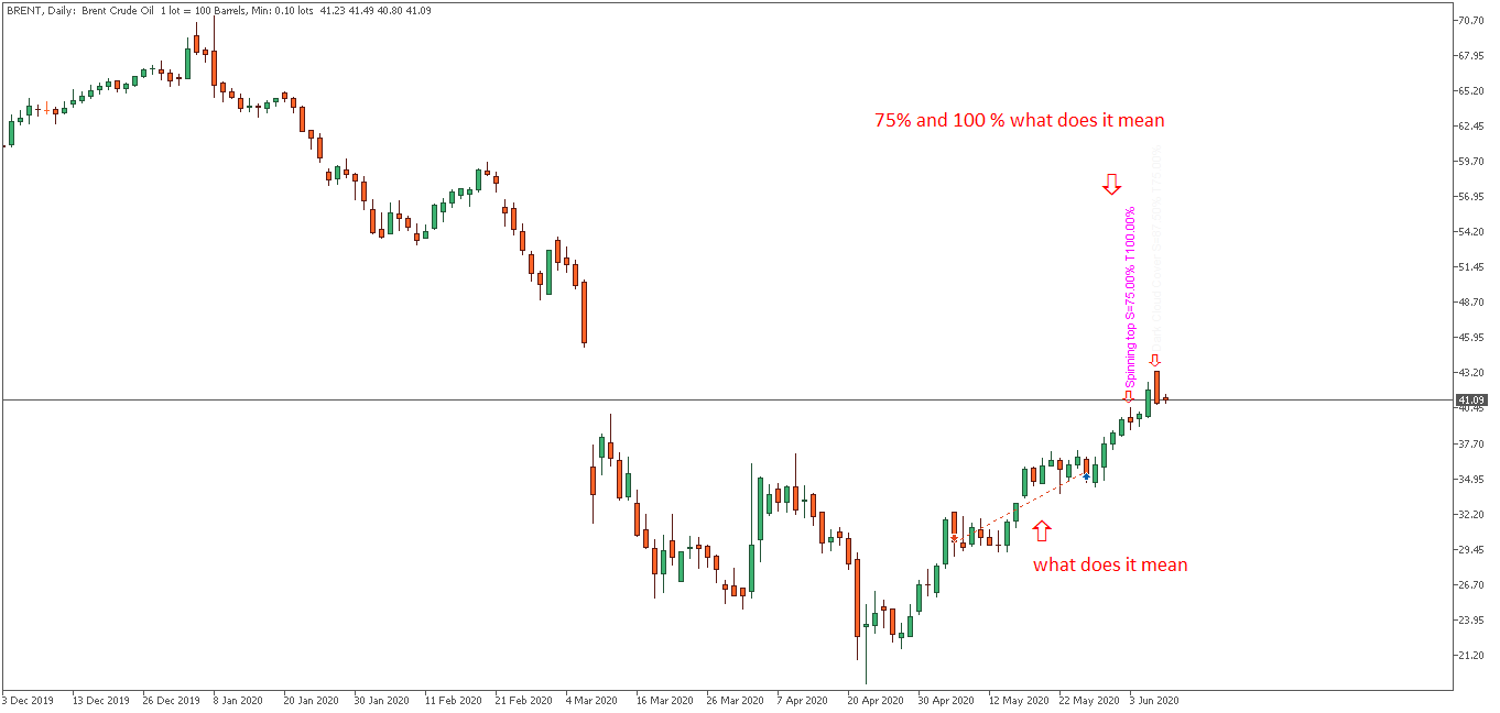 - In the description of the indicator, percentages are stated in paragraph 4: "Each caption of a pattern indicates: its name, the strength of the "S" signal (calculated in percentage terms using an empirical formula) that shows how close is the pattern at an ideal one, and the trend coefficient "T" (calculated on the basis of three candlesticks using a score system) that shows how close it the trend to an ideal one."