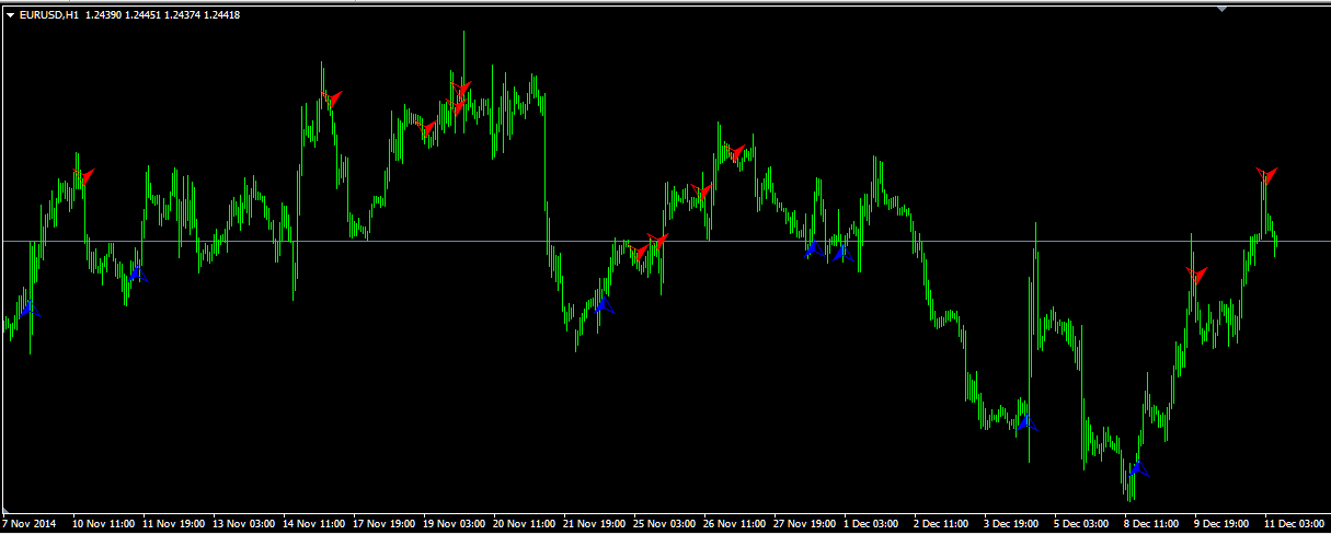Arrows paint for all terms, short, mid, and long term - so, this indicator is not useful as a trend indicator. Further, it doesn't always identify a trend reversal. Examine November 28, would have been nice to see a red arrow before the massive drop to 8-Dec lows. Additionally, period 24-Nov to 28-Nov show far too many false positive signals - all of which are already lows...