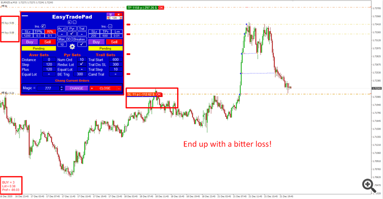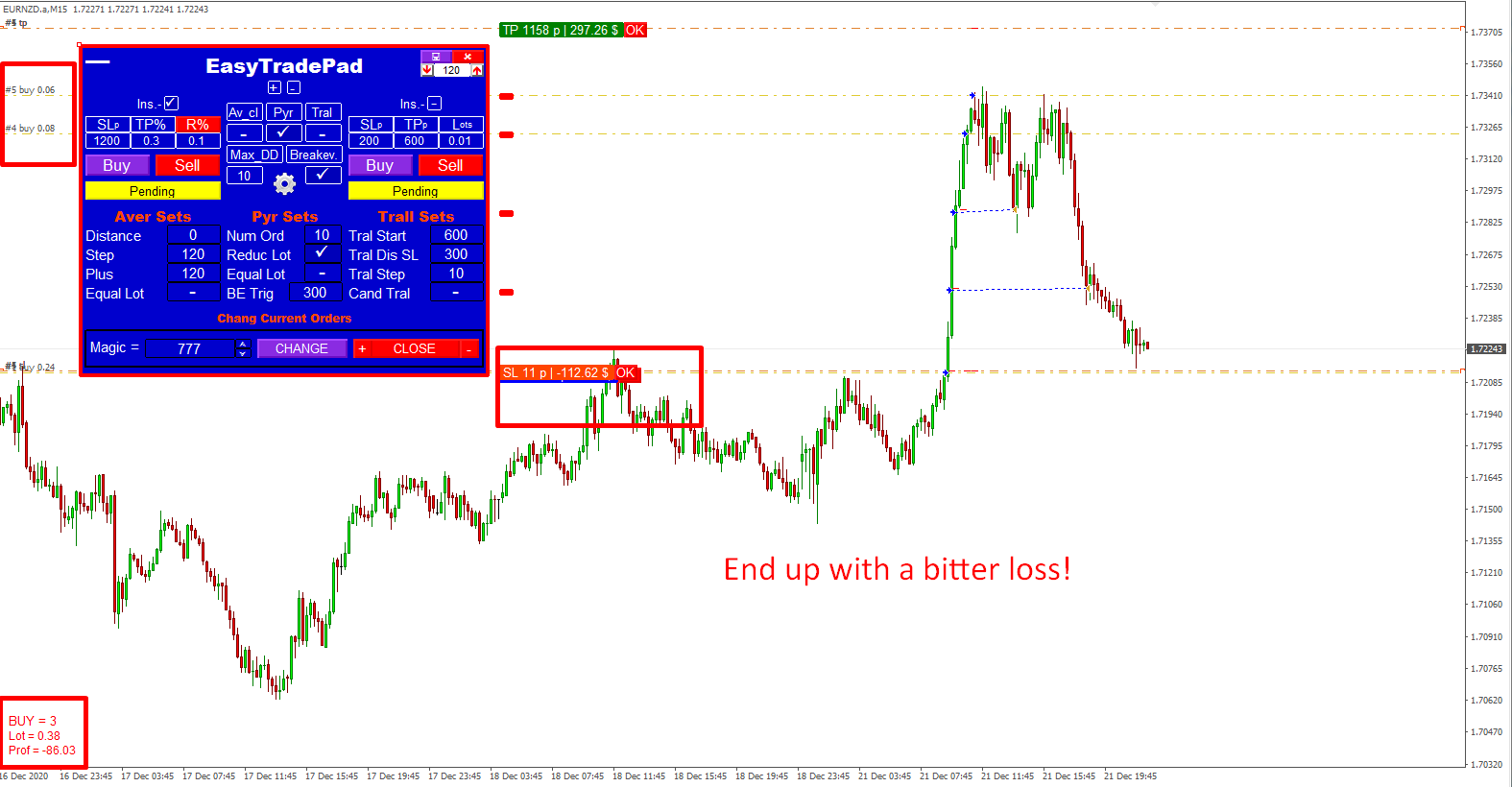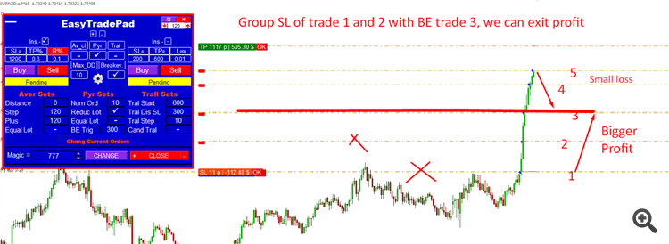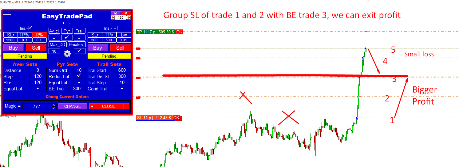 3. If our trade didn't quiet reach the TP and placing the SL to individual trade, we might end up with the last trade open in loss, (since most of the time last trade didn't reach the BE trigger level). and we break even and loose the profit of all pyramid built in the trend.